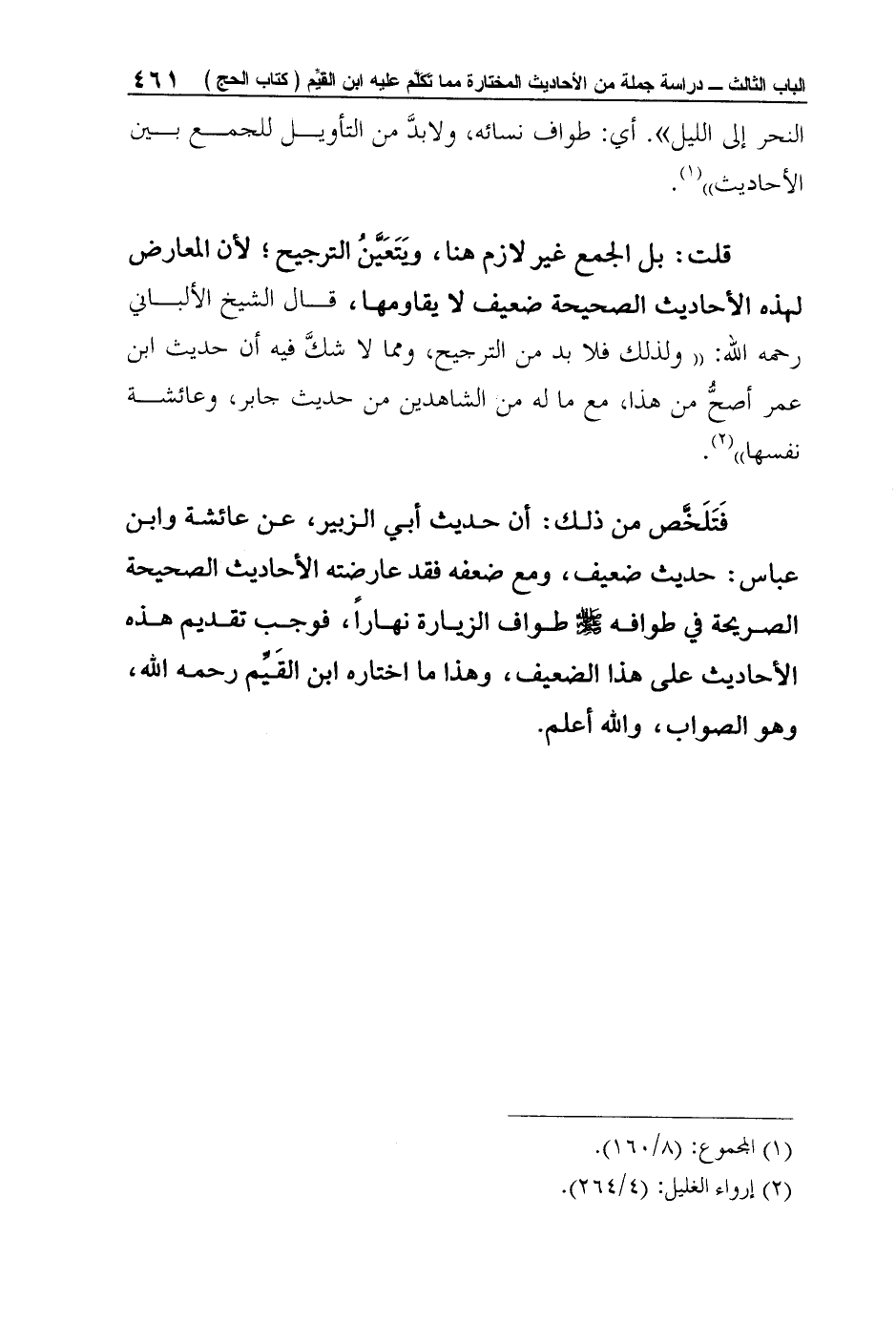 فَتَلَخَّص من ذلك: أن حديث أبي الزبير، عن عائشة وابن عباس: حديث ضعيف، ومع ضعفه فقد عارضته الأحاديث الصحيحة الصريحة في طوافه صلى الله عليه وسلم طواف الزيارة نهاراً، فوجب تقديم هذه الأحاديث على هذا الضعيف، وهذا ما اختاره ابن القَيِّم رحمه الله، وهو الصواب، والله أعلم.