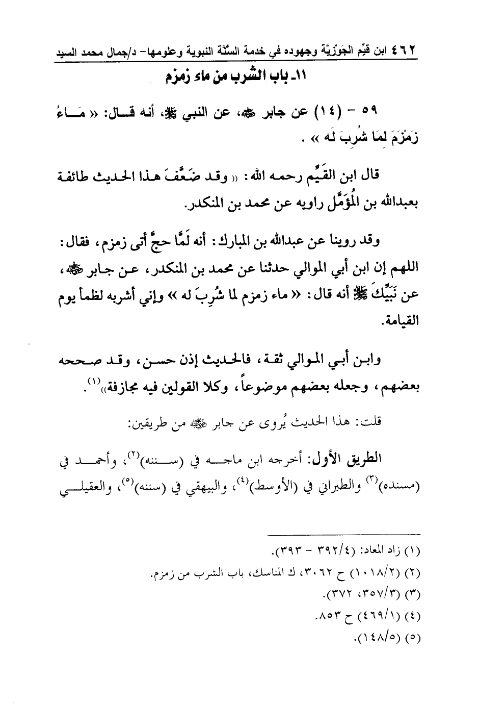 قال ابن القَيِّم رحمه الله: "وقد ضَعَّفَ هذا الحديث طائفة بعبد الله بن المُؤَمَّل راويه عن محمد بن المنكدر، وقد روينا عن عبد الله بن المبارك: أنه لَمَّا حجَّ أتى زمزم، فقال: اللهم إن ابن أبي الموالي حدثنا عن محمد بن المنكدر، عن جابر رضي الله عنه، عن نَبَيِّكَ صلى الله عليه وسلم أنه قال: "ماء زمزم لما شُرِبَ له " وإني أشربه لظمأ يوم القيامة، وابن أبي الموالي ثقة، فالحديث إذن حسن، وقد صححه بعضهم، وجعله بعضهم موضوعاً، وكلا القولين فيه مجازفة"1.