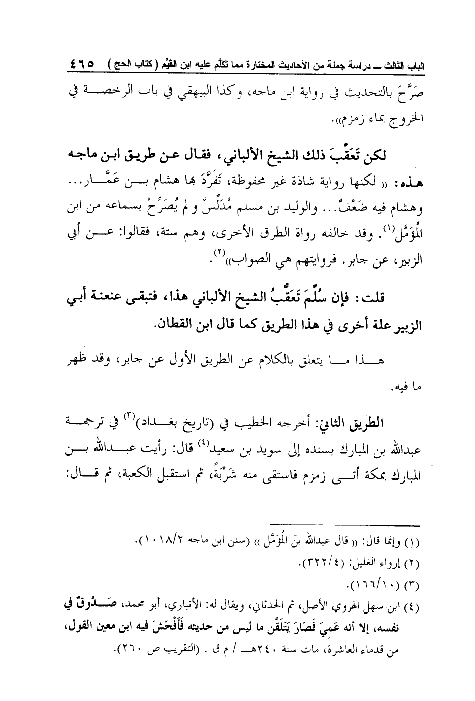 لكن تَعَقَّبَ ذلك الشيخ الألباني، فقال عن طريق ابن ماجه هذه: "لكنها رواية شاذة غير محفوظة، تَفَرَّدَ بها هشام بن عَمَّار ... وهشام فيه ضَعْفٌ ... والوليد بن مسلم مُدَلِّسٌ ولم يُصَرِّحْ بسماعه من ابن المُؤَمَّل1. وقد خالفه رواة الطرق الأخرى، وهم ستة، فقالوا: عن أبي الزبير، عن جابر. فروايتهم هي الصواب"2.
