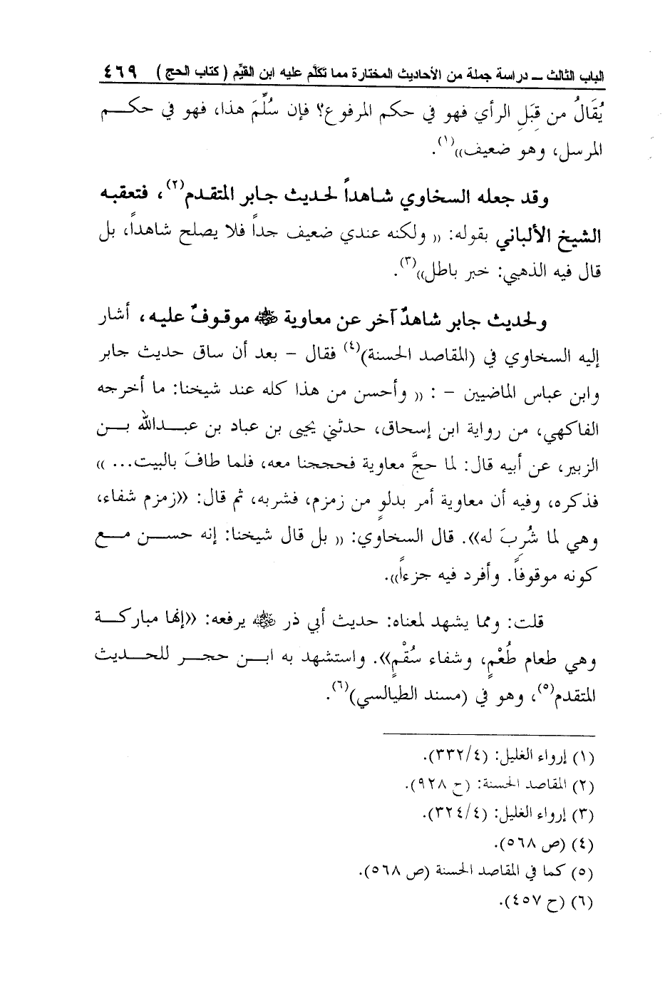 ولحديث جابر شاهدٌ آخر عن معاوية رضي الله عنه موقوفٌ عليه، أشار إليه السخاوي في (المقاصد الحسنة) 4 فقال - بعد أن ساق حديث جابر وابن عباس الماضيين -: "وأحسن من هذا كله عند شيخنا: ما أخرجه الفاكهي، من رواية ابن إسحاق، حدثني يحيى بن عباد بن عبد الله بن الزبير، عن أبيه قال: لما حجَّ معاوية فحججنا معه، فلما طافَ بالبيت ... " فذكره، وفيه أن معاوية أمر بدلوٍ من زمزم، فشربه، ثم قال: "زمزم شفاء، وهي لما شُرِبَ له". قال السخاوي: "بل قال شيخنا: إنه حسن مع كونه موقوفاً. وأفرد فيه جزءاً".
