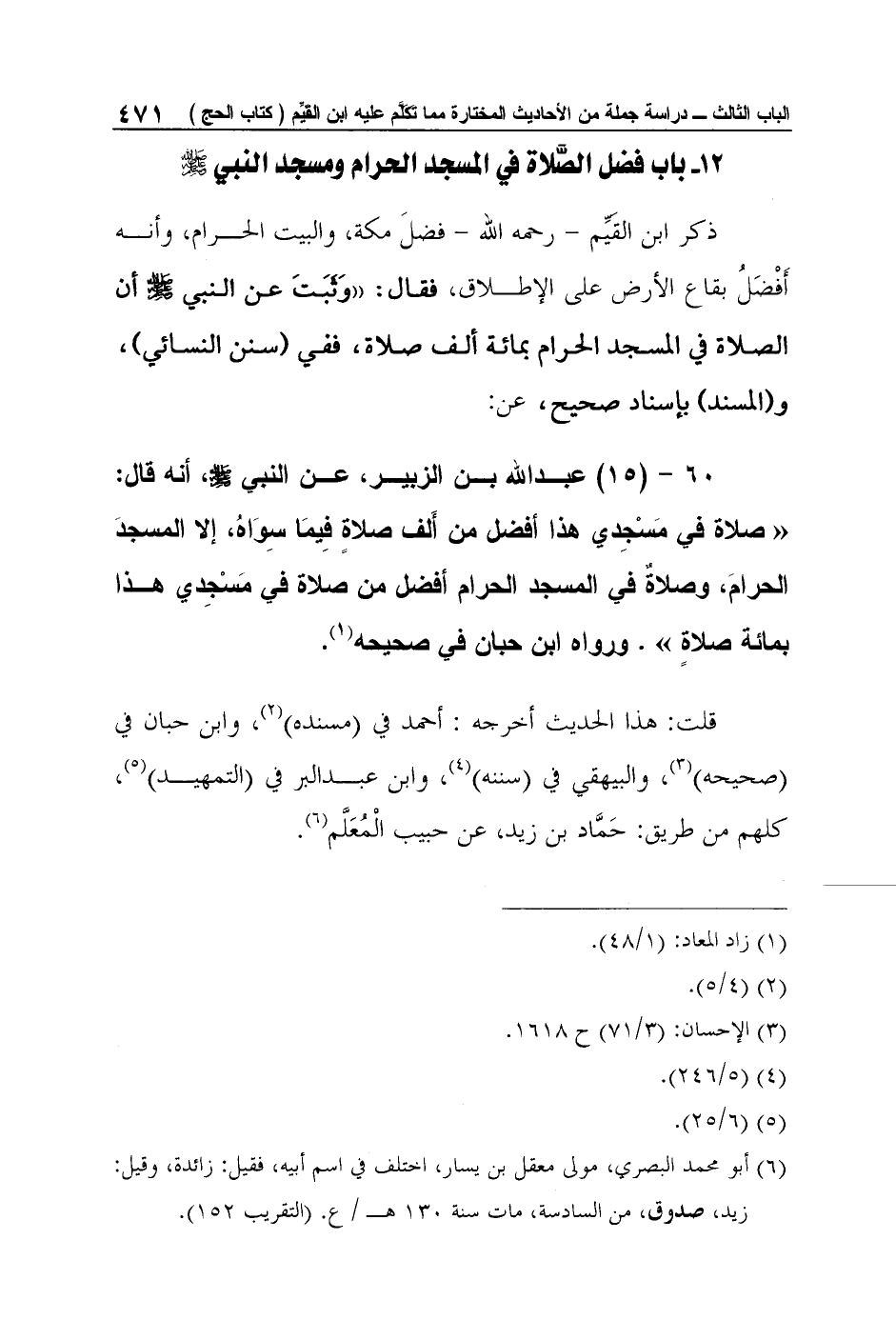 60 - (15) عبد الله بن الزبير، عن النبي صلى الله عليه وسلم، أنه قال: "صلاة في مَسْجِدي هذا أفضل من أَلف صلاةٍ فِيمَا سِوَاهُ، إلا المسجدَ الحرامَ، وصلاةٌ في المسجد الحرام أفضل من صلاة في مَسْجِدي هذا بمائة صلاةٍ ". ورواه ابن حبان في صحيحه1.