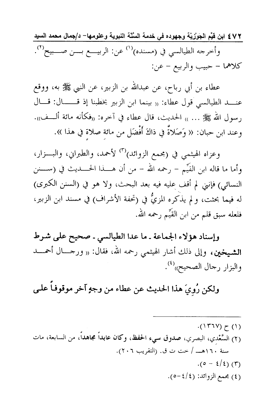 وعزاه الهيثمي في (مجمع الزوائد) 3 لأحمد، والطبراني، والبزار، وأما ما قاله ابن القَيِّم - رحمه الله - من أن هذا الحديث في (سنن النسائي) فإنني لم أقف عليه فيه بعد البحث، ولا هو في (السنن الكبرى) له فيما بحثت، ولم يذكره المزيُّ في (تحفة الأشراف) في مسند ابن الزبير، فلعله سبق قلم من ابن القَيِّم رحمه الله.