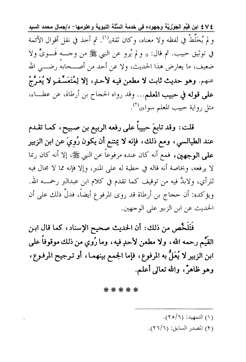 قلت: وقد تابعَ حبيباً على رفعه الربيع بن صبيح، كما تقدم عند الطيالسي، ومع ذلك، فإنه لا يمتنع أن يكون رُوِيَ عن ابن الزبير على الوجهين، فمع أنه كان عنده مرفوعاً عن النبي صلى الله عليه وسلم، إلا أنه كان ربما لا يرفعه، وبخاصة أنه قاله في خطبة له على المنبر، وإلا فإنه مما لا مجال فيه للرأي، ولابدَّ فيه من توقيف كما تقدم في كلام ابن عبد البر رحمه الله. ويؤكده: أن حجاج بن أرطاة قد روى المرفوع أيضاً، فدلَّ ذلك على أن الحديث عن ابن الزبير على الوجهين.