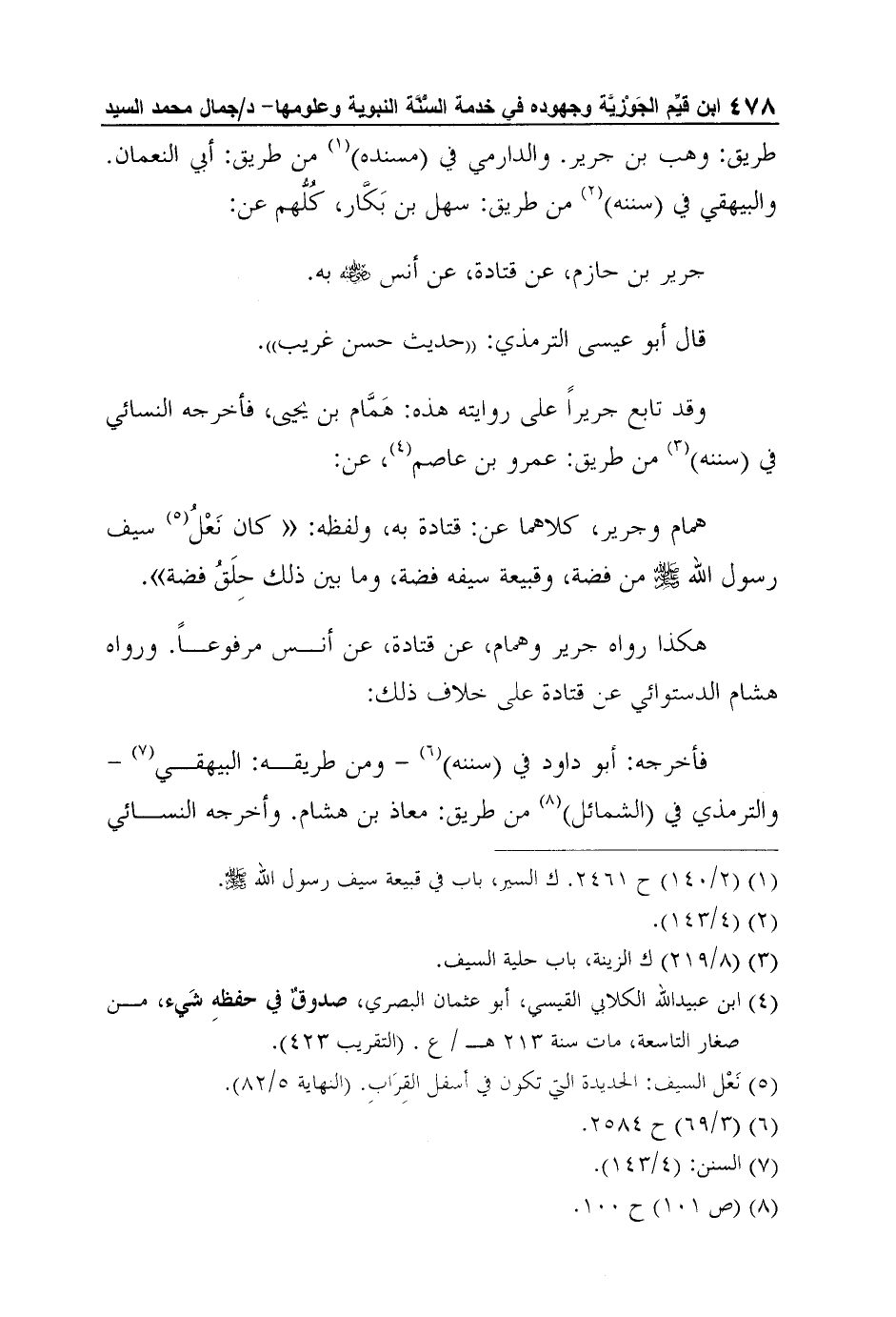 وقد تابع جريراً على روايته هذه: هَمَّام بن يحيى، فأخرجه النسائي في (سننه) 3 من طريق: عمرو بن عاصم4، عن: همام وجرير، كلاهما عن: قتادة به، ولفظه: " كان نَعْلُ5 سيف رسول الله صلى الله عليه وسلم من فضة، وقبيعة سيفه فضة، وما بين ذلك حِلَقُ فضة".