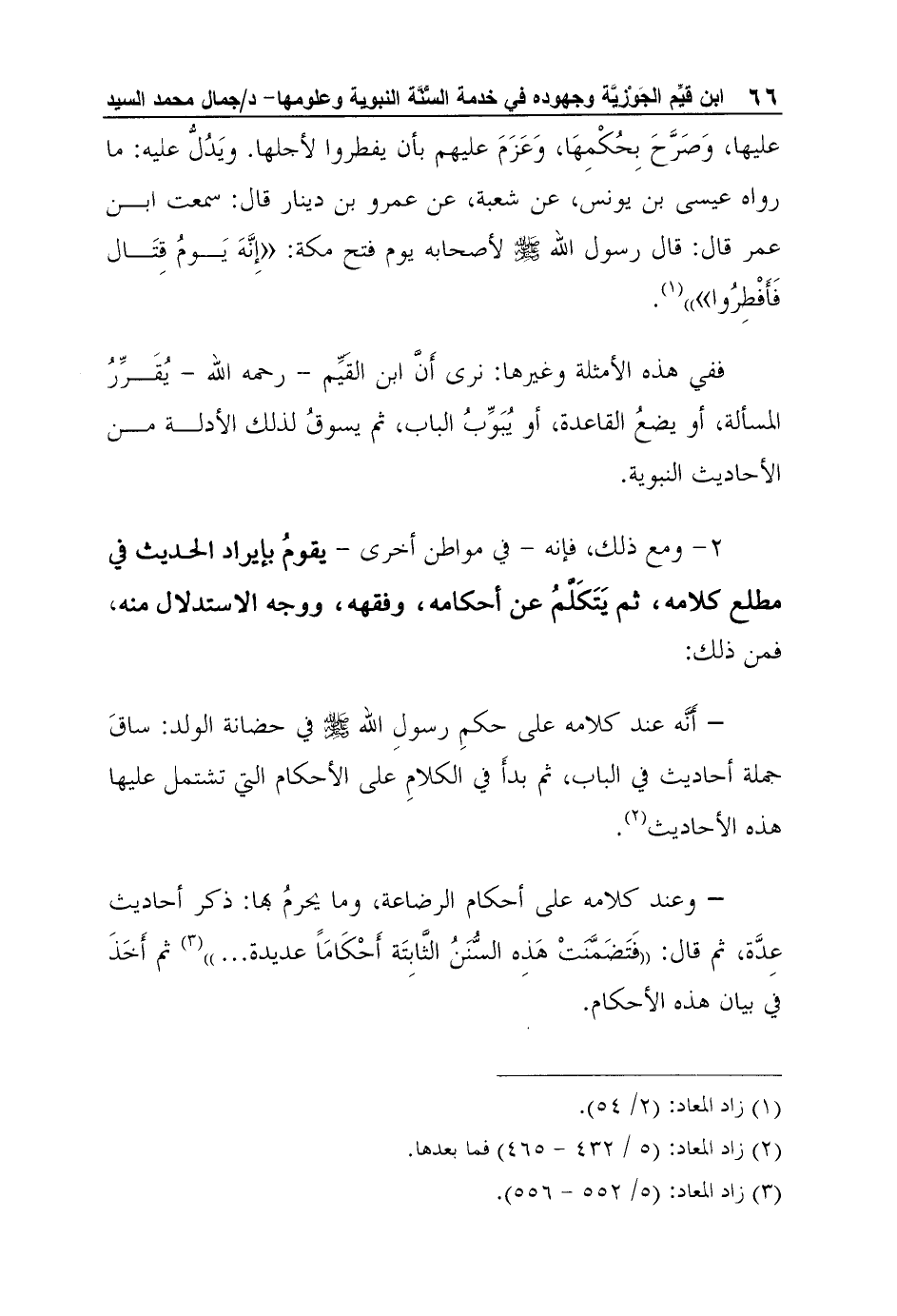 ففي هذه الأمثلة وغيرها: نرى أَنَّ ابن القَيِّم - رحمه الله - يُقَرِّرُ المسألة، أو يضعُ القاعدة، أو يُبَوِّبُ الباب، ثم يسوقُ لذلك الأدلة من الأحاديث النبوية.