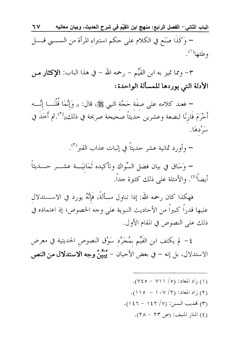 4- لم يكتف ابن القَيِّم بِمُجَرَّدِ سَوْق النصوصِ الحديثية في معرض الاستدلال، بل إنه - في بعض الأحيان - يُبَيِّنُ وجه الاستدلال من النص