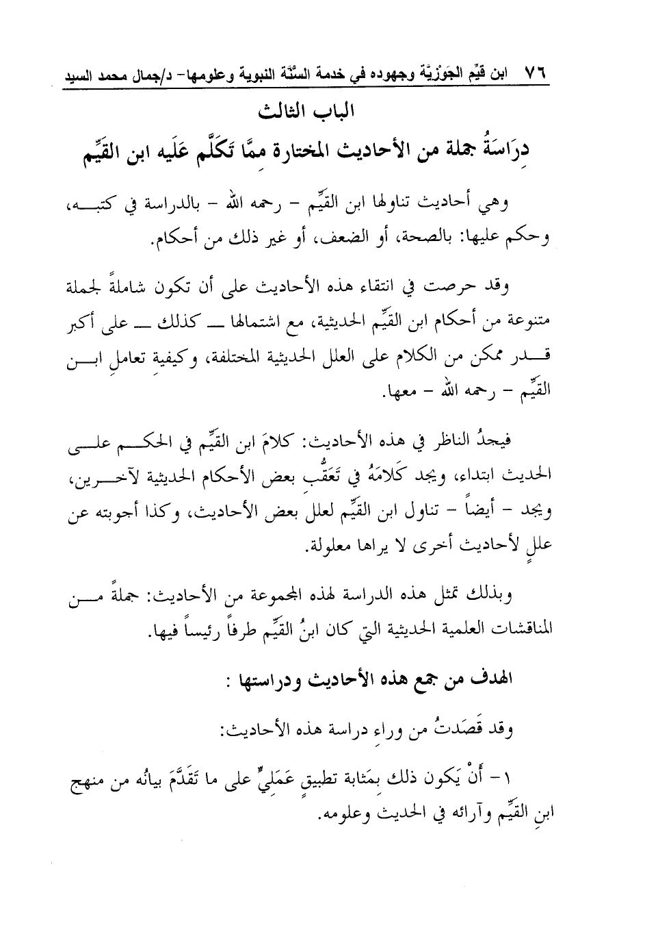 1- أَنْ يَكون ذلك بِمَثابة تطبيقٍ عَمَلِيٍّ على ما تَقَدَّمَ بيانُه من منهج ابنِ القَيِّم وآرائه في الحديث وعلومه.