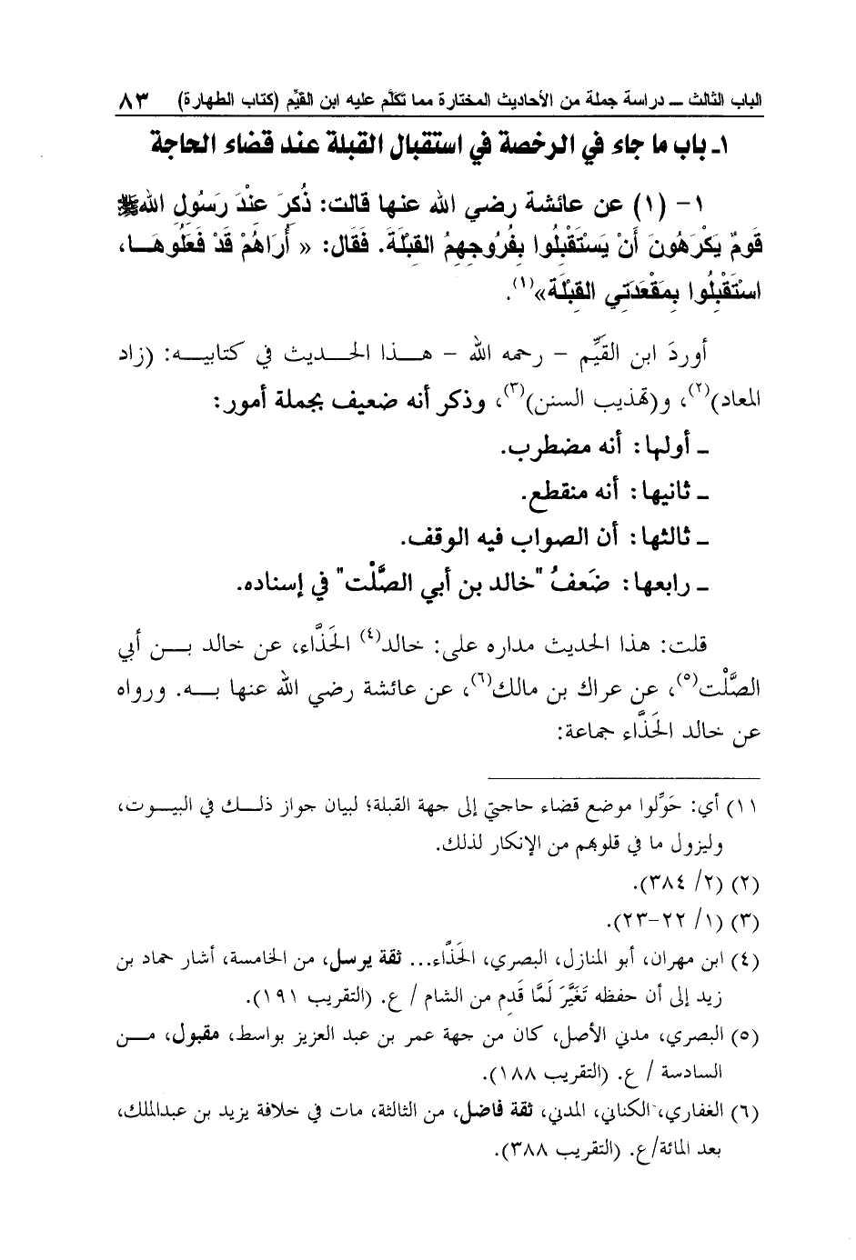 1- (1) عن عائشة رضي الله عنها قالت: ذُكِرَ عِنْدَ رَسُوِلِ الله صلى الله عليه وسلم قَومٌ يَكْرَهُونَ أَنْ يَسْتَقْبِلُوا بِفُرُوجِهِمُ القِبْلَةَ. فَقَال: "أُرَاهُمْ قَدْ فَعَلُوهَا، اسْتَقْبِلُوا بِمَقْعَدَتِي القِبْلَة" 1.