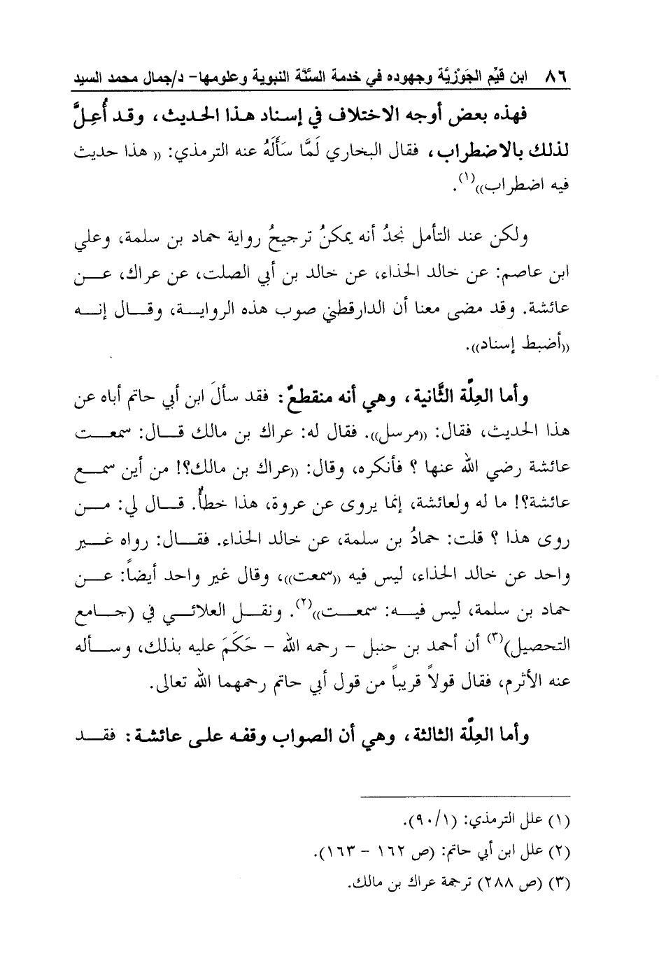 وأما العِلَّة الثَّانية، وهي أنه منقطعٌ: فقد سألَ ابن أبي حاتم أباه عن هذا الحديث، فقال: "مرسل". فقال له: عراك بن مالك قال: سمعت عائشة رضي الله عنها؟ فأنكره، وقال: "عراك بن مالك؟! من أين سمع عائشة؟! ما له ولعائشة، إنما يروى عن عروة، هذا خطأٌ. قال لي: من روى هذا؟ قلت: حمادُ بن سلمة، عن خالد الحذاء. فقال: رواه غير واحد عن خالد الحذاء، ليس فيه "سمعت"، وقال غير واحد أيضاً: عن حماد بن سلمة، ليس فيه: سمعت"2. ونقل العلائي في (جامع التحصيل) 3 أن أحمد بن حنبل - رحمه الله - حَكَمَ عليه بذلك، وسأله عنه الأثرم، فقال قولاً قريباً من قول أبي حاتم رحمهما الله تعالى.
