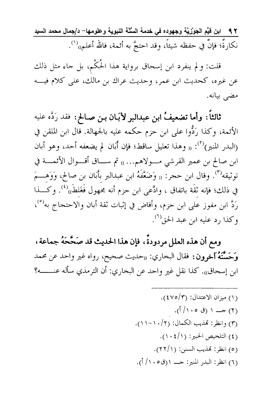 ثالثاً: وأما تضعيفُ ابن عبد البر لأ بَان بن صالح: فقد رَدَّه عليه الأئمة، وكذا رَدُّوا على ابن حزم حكمه عليه بالجهالة. قال ابن الملقن في (البدر المنير) 2: "وهذا تعليل ساقط؛ فإن أَبَان لم يضعفه أحد، وهو أبان ابن صالح بن عمير القرشي مولاهم ... " ثم ساق أقوال الأئمة في توثيقه3. وقال ابن حجر: "وَضَعَّفَهُ ابن عبد البر بِأَبَان بن صالح، وَوَهِمَ في ذلك؛ فإنه ثِقَة باتفاق، وادَّعى ابن حزم أنه مجهول فَغَلِطَ"4. وكذا رَدَّ ابن مفوز على ابن حزم، وأفاض في إثبات ثقة أبان والاحتجاج به5، وكذا رد عليه ابن عبد الحق6.