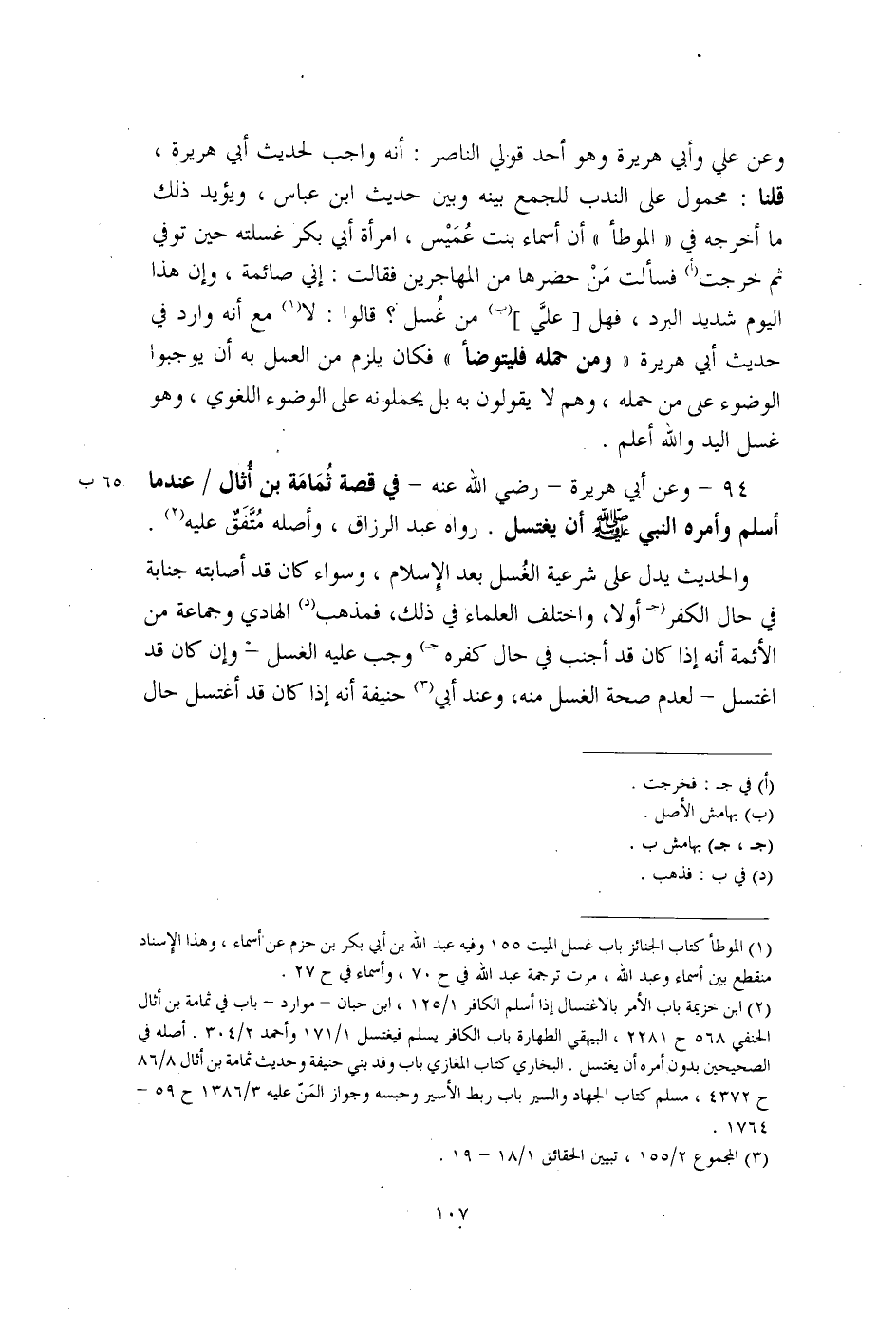 94 - وعن أبي هريرة - رضي الله عنه - في قصة ثُمَامَة بن أُثال عندما أسلم وأمره النبي - صلى الله عليه وسلم - أن يغتسل. رواه عبد الرزاق، وأصله مُتَّفَقٌ عليه (¬2).