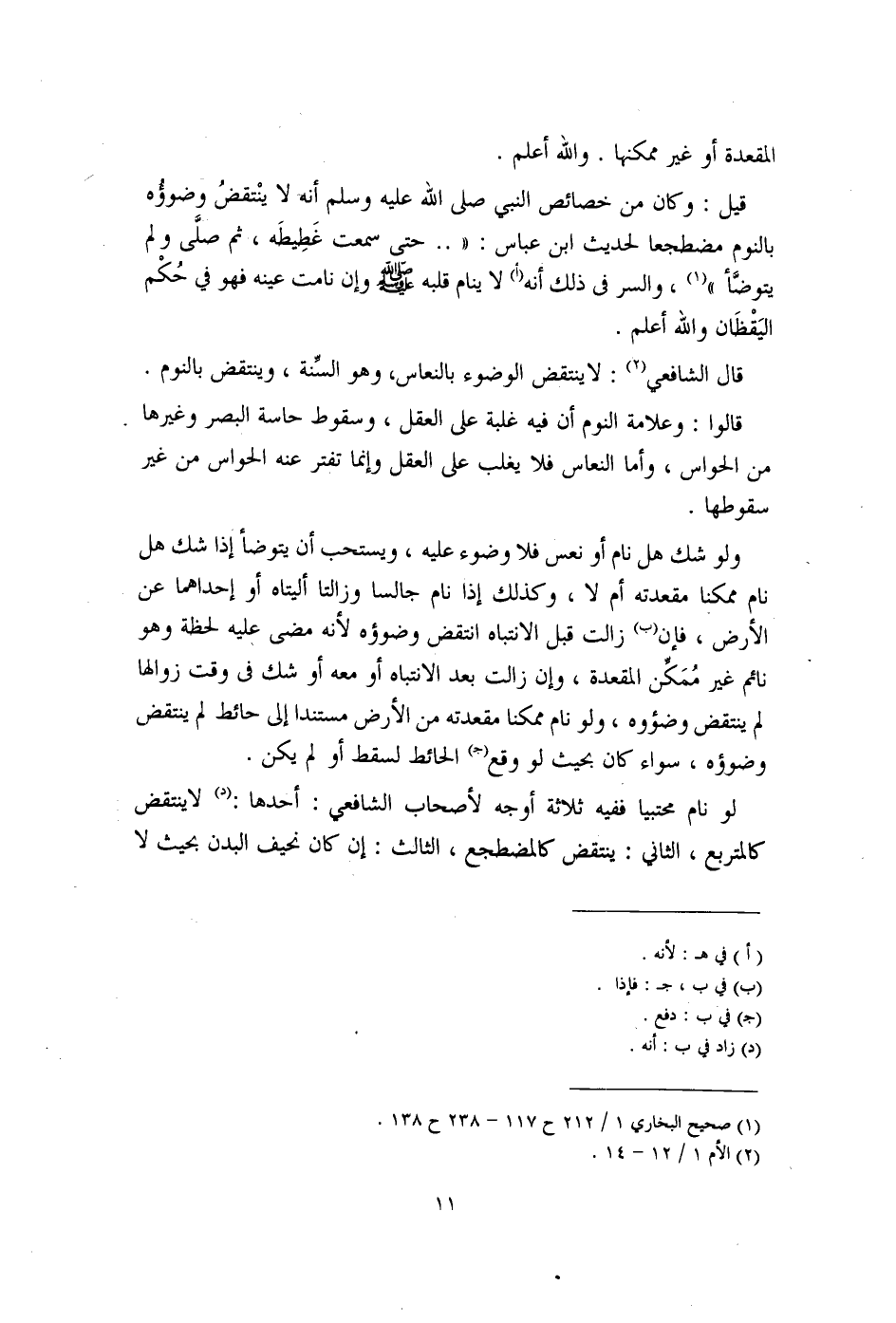 قيل: وكان من خصائص النبي صلى الله عليه وسلم أنه لا ينْتقضُ وضوؤُه بالنوم مضطجعا لحديث ابن عباس: " .. حتى سمعت غَطيطَه، ثم صلَّى ولم يتوضَّأ" (¬1)، والسر في ذلك أنه (أ) لا ينام قلبه - صلى الله عليه وسلم - وإن نامت عينه فهو في حُكْم اليَقْظَان والله أعلم.