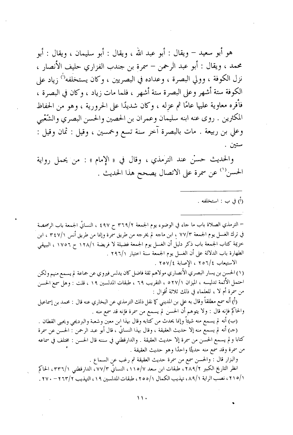 (¬1) الحسن بن يسار البصري الأنصاري مولاهم ثقة فاضل كان يدلس فيروي عن جماعة لم يسمع منهم ولكن احتمل الأئمة تدليسه، الميزان 1/ 527، التقريب 69، طبقات المدلسين 19، قلت: وهل سمع الحسن من سمرة أم لا، للعلماء في ذلك ثلاثة أقوال: