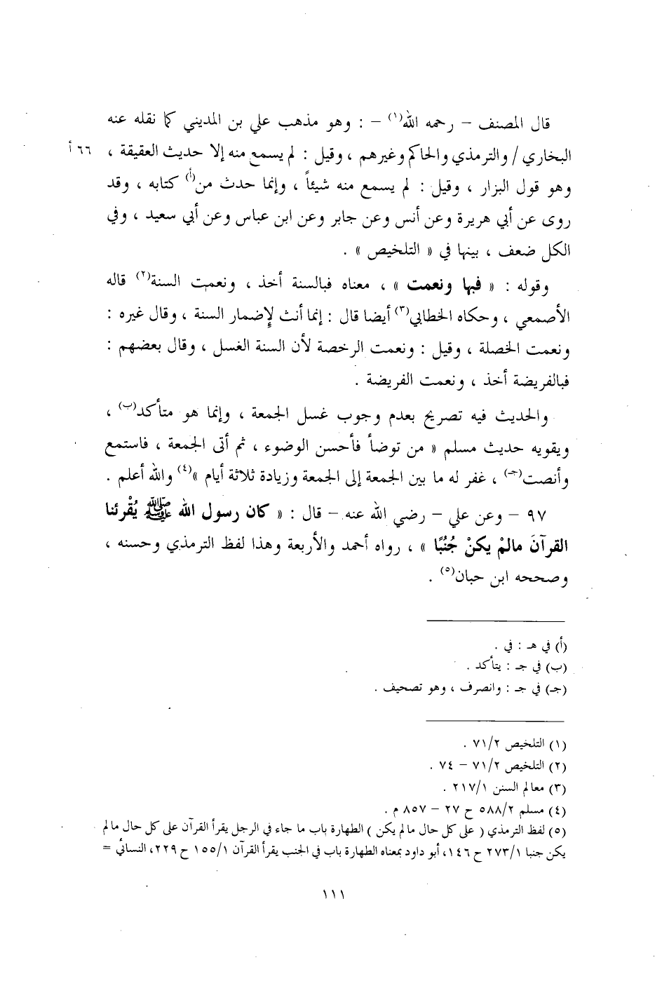 97 - وعن علي - رضي الله عنه - قال: "كان رسول الله - صلى الله عليه وسلم - يُقْرئنا القرآنَ ما لمْ يكنْ جُنُبًا"، رواه أحمد والأربعة وهذا لفظ الترمذي وحسنه، وصححه ابن حبان (¬5).