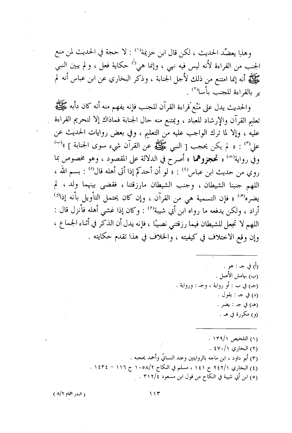 والحديث يدل على مَنْع قراءة القرآن للجنب فإنه يفهم منه أنه كان دأبه - صلى الله عليه وسلم - تعليم القرآن والإِرشاد للعباد، ويمتنع منه حال الجنابة فما ذاك إلا لتحريم القراءة عليه، وإلا لما ترك الواجب عليه من التعليم، وفي بعض روايات الحديث عن علي (¬3): "لم يكن يحجب [النبي - صلى الله عليه وسلم - عن القرآن شيء سوى الجنابة] " (ب) وفي رواية (جـ) "تحجزوهما" أصرح في الدلالة على المقصود، وهو مخصوص بما روي من حديث ابن عباس (¬4): "لو أن أحدكم إذا أتى أهله قال (د): بسم الله، اللهم جنبنا الشيطان، وجنب الشيطان ما رزقتنا، فقضى بينهما ولد، لم يضره (هـ) "فإن التسمية هي من القرآن، وإن كان يحتمل التأويل بأنه إذا (و) أراد، ولكن يدفعه ما رواه ابن أبي شيبة (¬5): وكان إذا غشي أهله فأنزل قال: اللهم لا تجعل للشيطان فيما رزقتني نصيبًا، فإنه يدل أن الذكر في أثناء الجماع، وإن وقع الاختلاف في كيفيته، والخلاف في هذا تقدم حكايته.