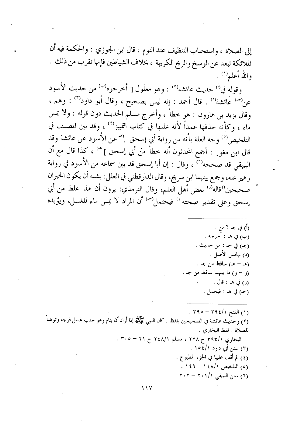 وقوله في (أ) حديث عائشة (¬2): وهو معلول [أخرجوه (ب) من حديت الأسود عن (جـ) عائشة (د). قال أحمد: إنه ليس بصحيح، وقال أبو داود (¬3): وهم، وقال يزيد بن هارون: هو خطأ، وأخرج مسلم الحديث دون قوله: ولا يمس ماء، وكأنه حذفها عمدًا لأنه عللها في كتاب التمييز (¬4)، وقد بين المصنف في التلخيص (¬5) وجه العلة بأنه من رواية أبي إسحق] (هـ عن الأسود عن عائشة وقد قال ابن مغور: أجمع المحدثون أنه خطأ من أبي إسحق] هـ)، كذا قال مع أن البيهقي قد صححه (¬6)، وقال: إن أبا إسحق قد بين سماعه من الأسود في رواية زهير عنه، وجمع بينهما ابن سريج، وقال الدارقطني في العلل: يشبه أن يكون الخبران صحيحين (وقاله (ز) بعض أهل العلم، وقال الترمذي: يرون أن هذا غلط من أبي إسحق وعلى تقدير صحته و) فيحتمل (حـ) أن المراد لا يمس ماء للغسل، ويؤيده