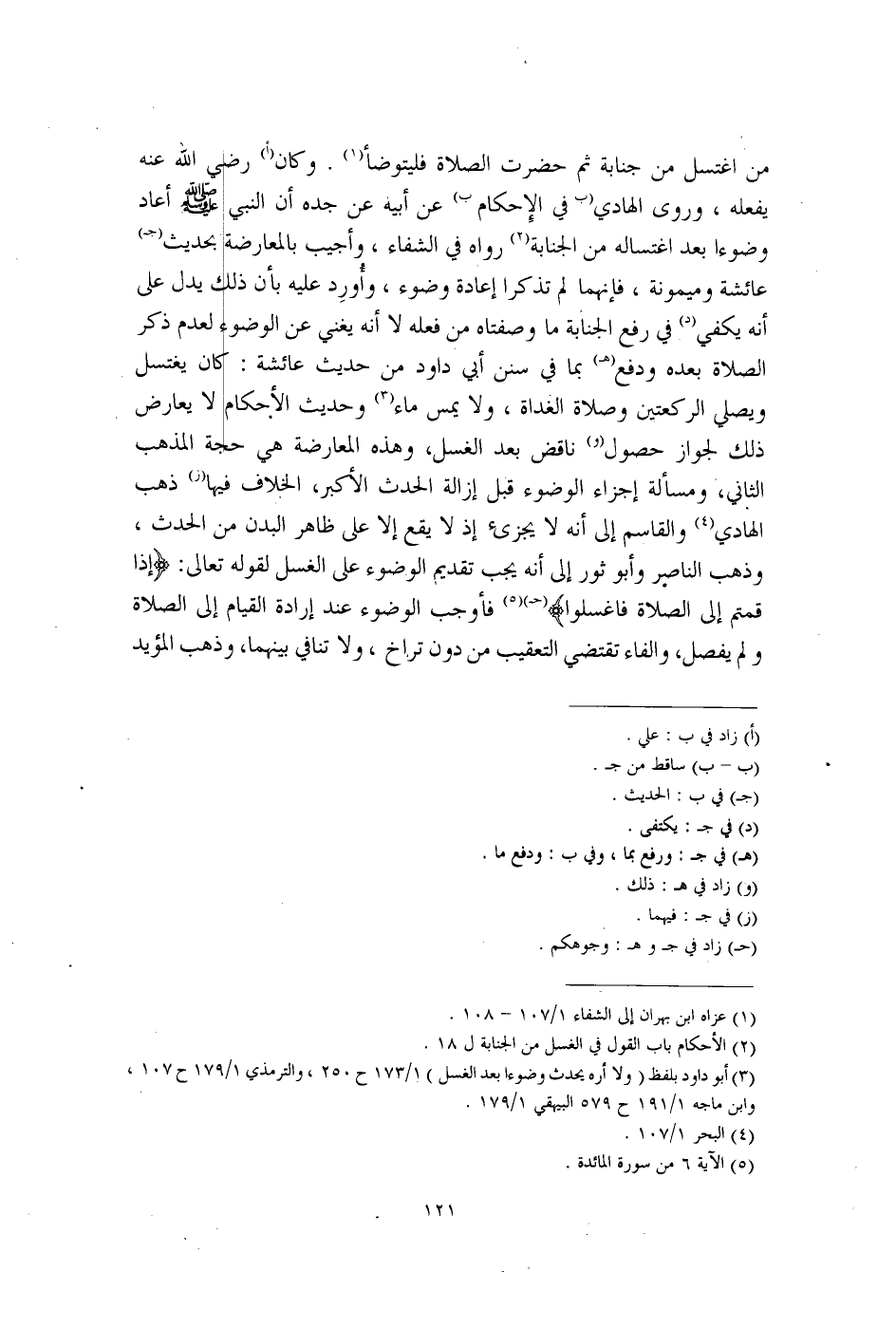 (¬3) أبو داود بلفظ (ولا أره يحدث وضوءا بعد الغسل) 1/ 173 ح 250، والترمذي 1/ 179 ح 107، وابن ماجه 1/ 191 ح 579 البيهقي 1/ 179.