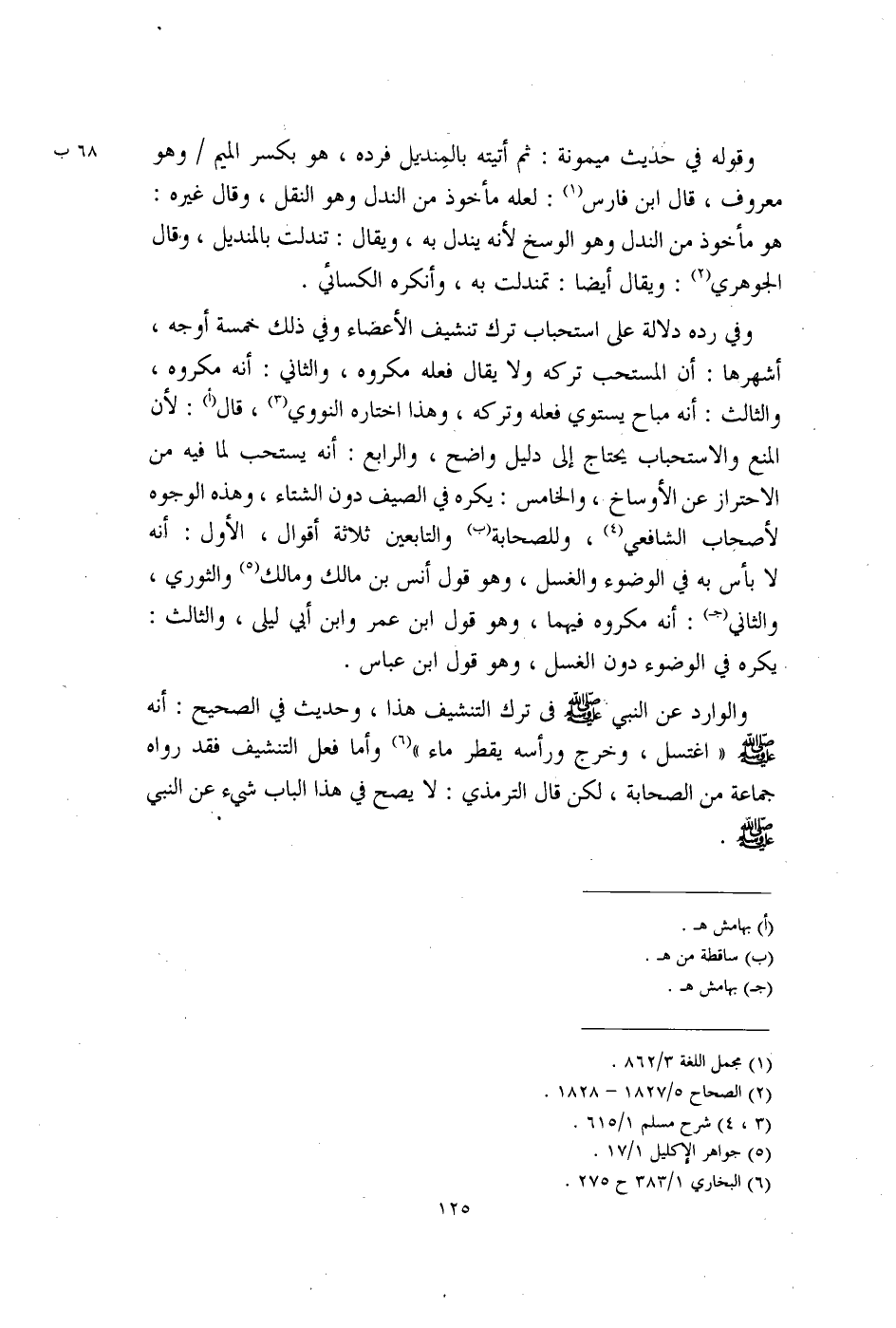 وفي رده دلالة على استحباب ترك تنشيف الأعضاء وفي ذلك خمسة أوجه، أشهرها: أن المستحب تركه ولا يقال فعله مكروه، والثاني: أنه مكروه، والثالث: أنه مباح يستوي فعله وتركه، وهذا اختاره النووي (¬3)، قال (أ): لأن المنع والاستحباب يحتاج إلى دليل واضح، والرابع: أنه يستحب لا فيه من الاحتراز عن الأوساخ، والخامس: يكره في الصيف دون الشتاء، وهذه الوجوه لأصحاب الشافعي (¬4)، وللصحابة (ب) والتابعين ثلاثة أقوال، الأول: أنه لا بأس به في الوضوء والغسل، وهو قول أنس بن مالك ومالك (¬5) والثوري، والثاني (جـ): أنه مكروه فيهما، وهو قول ابن عمر وابن أبي ليلى، والثالث: يكره في الوضوء دون الغسل، وهو قول ابن عباس.