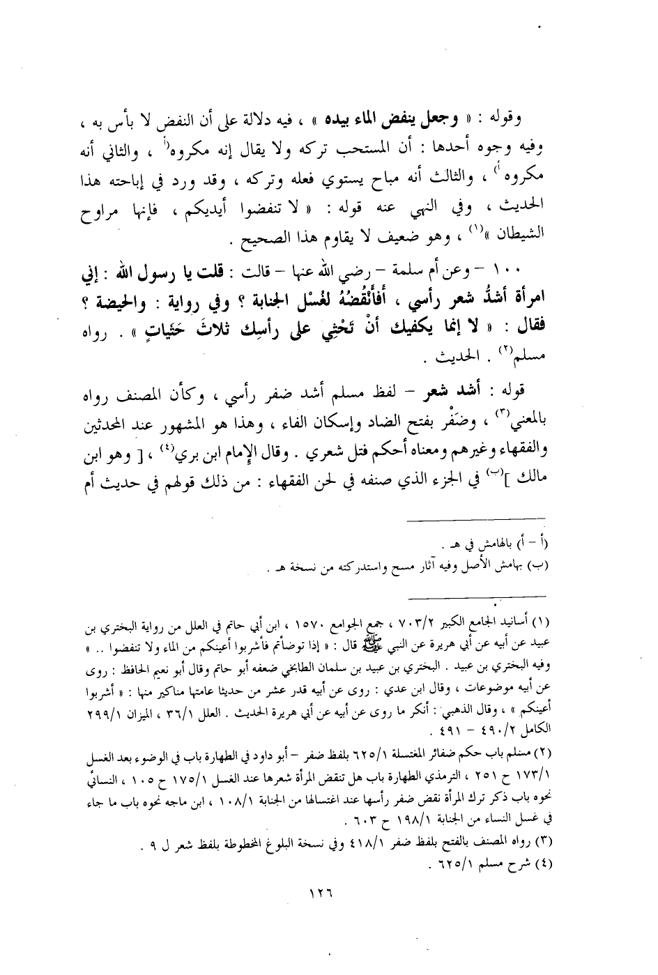 (¬2) مسلم باب حكم ضفائر المغتسلة 1/ 625 بلفظ ضفر -أبو داود في الطهارة باب في الوضوء بعد الغسل 1/ 173 ح 251، الترمذي الطهارة باب هل تنقض المرأة شعرها عند الغسل 1/ 175 ح 105، النسائي نحوه باب ذكر ترك المرأة نقض ضفر رأسها عند اغتسالها من الجنابة 1/ 108، ابن ماجه نحوه باب ما جاء في غسل النساء من الجنابة 1/ 198 ح 603.