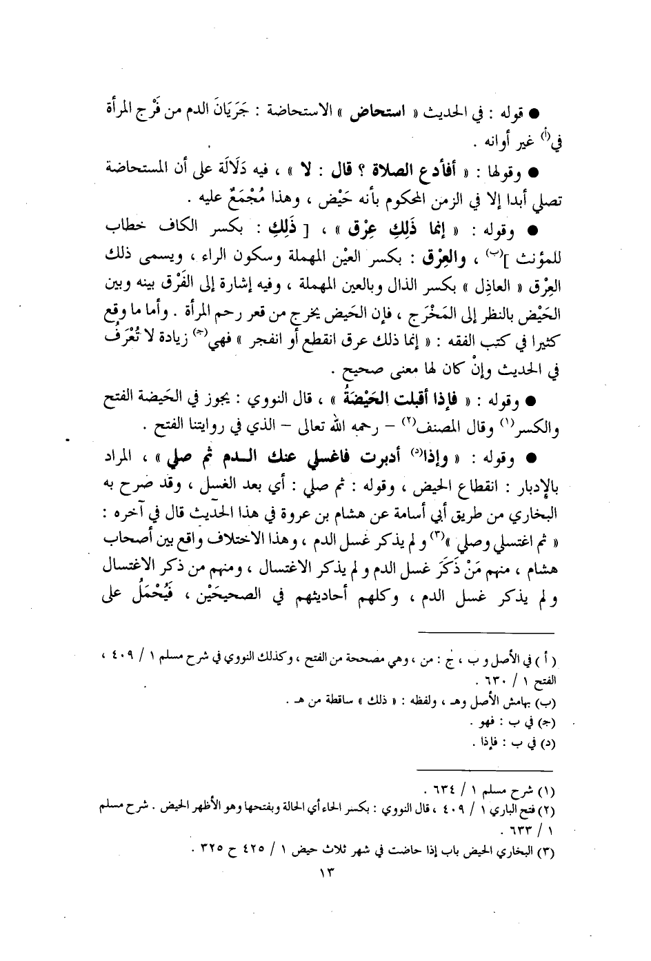 (¬2) فتح الباري 1/ 409، قال النووي: بكسر الحاء أي الحالة وبفتحها وهو الأظهر الحيض. شرح مسلم 1/ 633.