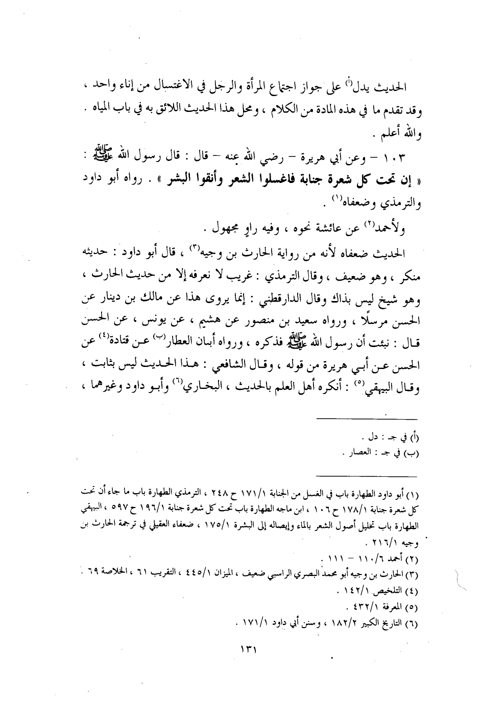 (¬1) أبو داود الطهارة باب في الغسل من الجنابة 1/ 171 ح 248، الترمذي الطهارة باب ما جاء أن تحت كل شعرة جنابة 1/ 178 ح 106، ابن ماجه الطهارة باب تحت كل شعرة جنابة 1/ 196 ح 517، البيهقي الطهارة باب تخليل أصول الشعر بالماء وإيصاله إلى البشرة 1/ 175، ضعفاء العقيلي في ترجمة الحارث بن وجيه 1/ 216.