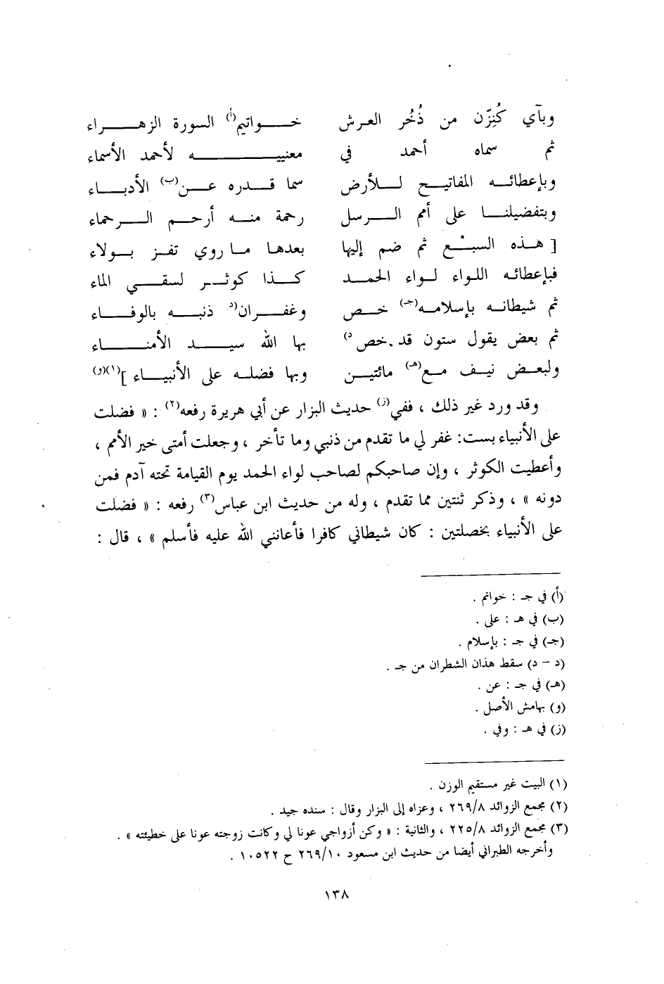 ولبعض نيف مع (هـ) مائتين ... وبها فضله على الأنبياء] (¬1) (و)