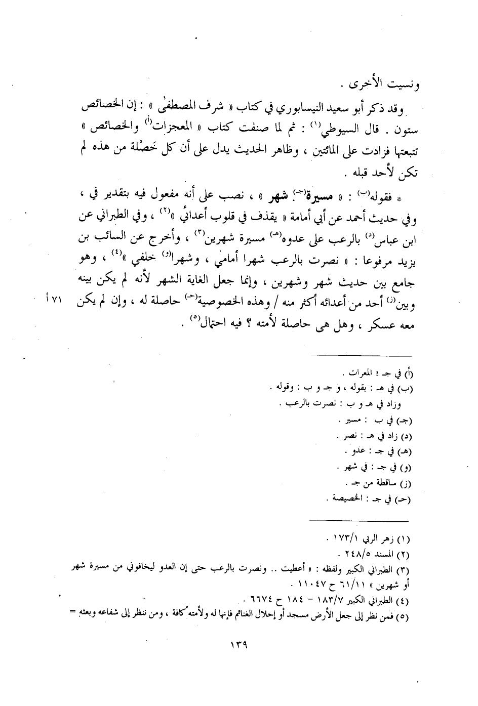 * فقوله (ب): "مسيرة (جـ) شهر"، نصب على أنه مفعول فيه بتقدير في، وفي حديث أحمد عن أبي أمامة "يقذف في قلوب أعدائي" (¬2)، وفي الطبراني عن ابن عباس (د) بالرعب على عدوه (هـ) مسيرة شهرين (¬3)، وأخرج عن السائب بن يزيد مرفوعًا: "نصرت بالرعب شهرا أمامي، وشهرا (و) خلفي" (¬4)، وهو جامع بين حديث شهر وشهرين، وإنما جعل الغاية الشهر لأنه لم يكن بينه وبين (ز) أحد من أعدائه أكثر منه وهذه الخصوصية (حـ) حاصلة له، وإن لم يكن معه عسكر، وهل هي حاصلة لأمته؟ فيه احتمال (¬5).