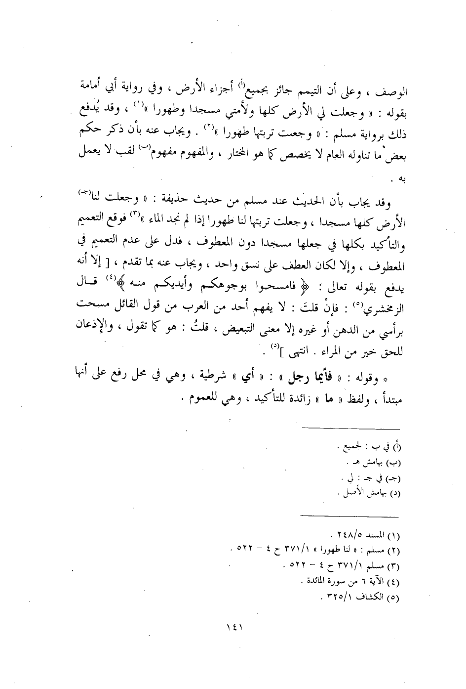وقد يجاب بأن الحديث عند مسلم من حديث حذيفة: "وجعلت لنا (جـ) الأرض كلها مسجدا، وجعلت تربتها لنا طهورا إذا لم نجد الماء" (¬3) فوقع التعميم والتأكيد بكلها في جعلها مسجدا دون المعطوف، فدل على عدم التعميم في المعطوف، وإلا لكان العطف على نسق واحد، ويجاب عنه بما تقدم، [إلا أنه يدفع بقوله تعالى: {فامسحوا بوجوهكم وأيديكم منه} (¬4) قال الزمخشري (¬5): فإنْ قلتَ: لا يفهم أحد من العرب من قول القائل مسحت برأسي من الدهن أو غيره إلا معنى التبعيض، قلتُ: هو كما تقول، والإِذعان للحق خير من الراء. انتهى] (د).