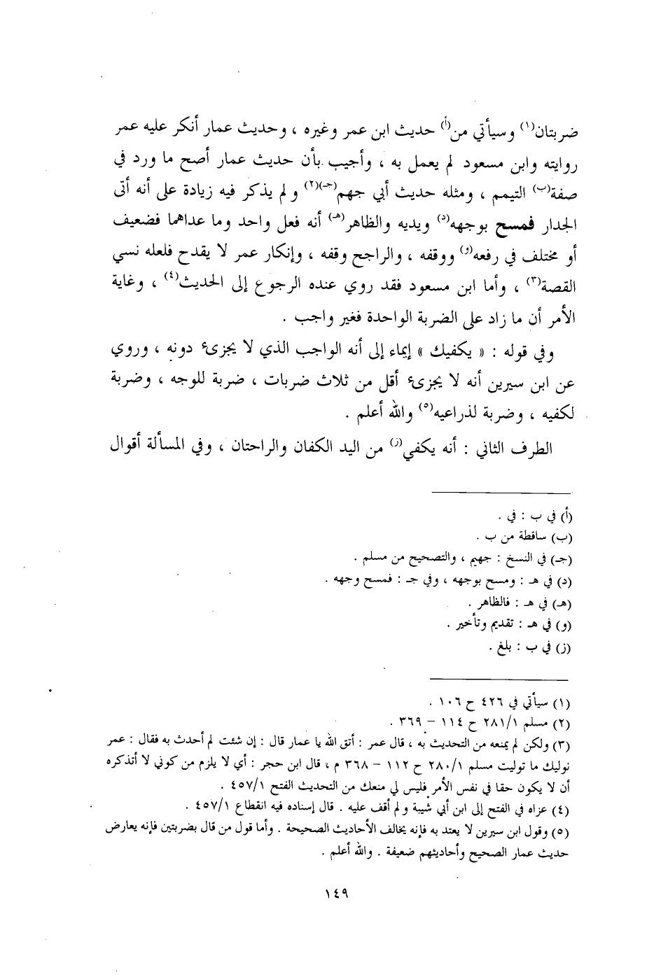 (¬5) وقول ابن سيرين لا يعتد به فإنه يخالف الأحاديث الصحيحة. وأما قول من قال بضربتين فإنه يعارض حديث عمار الصحيح وأحاديثهم ضعيفة. والله أعلم.