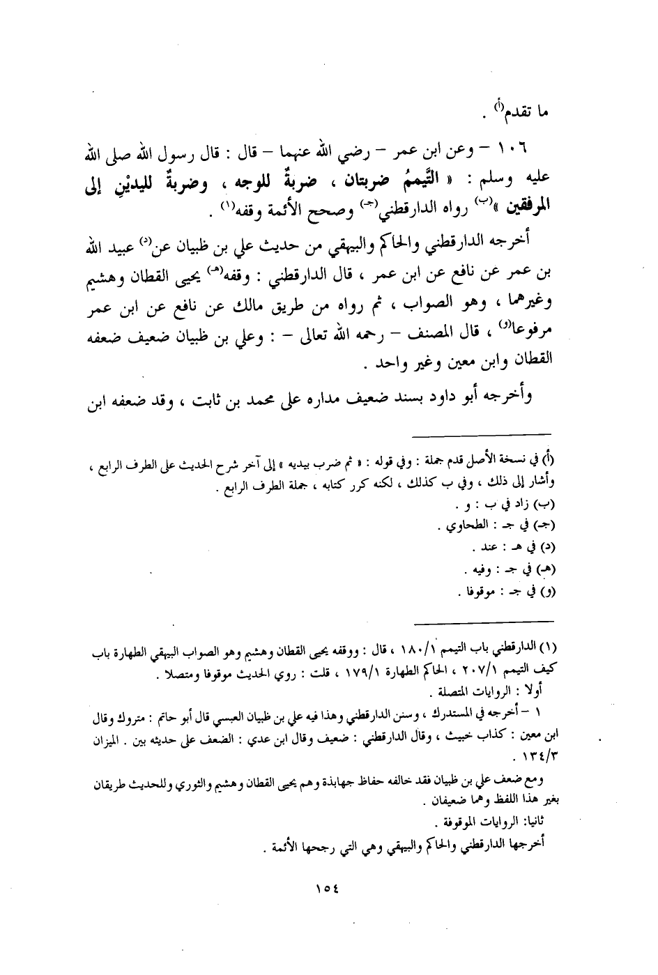 106 - وعن ابن عمر - رضي الله عنهما - قال: قال رسول الله صلى الله عليه وسلم: "التَّيممُ ضربتان، ضربةٌ للوجه، وضربة لليديْنِ إلى المرفقين" (ب) رواه الدارقطني (جـ) وصحح الأئمة وقفه (¬1).