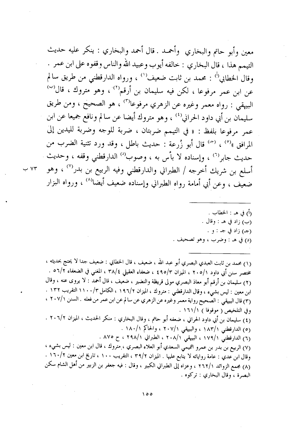 معين وأبو حاتم والبخاري وأحمد. قال أحمد والبخاري: ينكر عليه حديث التيمم هذا، قال البخاري: خالفه أيوب وعبيد الله والناس وقفوه على ابن عمر. وقال الخطابي (أ): محمد بن ثابت ضعيف (¬1)، ورواه الدارقطني من طريق سالم عن ابن عمر مرفوعًا، لكن فيه سليمان بن أرقم (¬2)، وهو متروك، قال (ب) البيهقي: رواه معمر وغيره عن الزهري مرفوعًا (¬3)، هو الصحيح، ومن طريق سليمان بن أبي داود الحراني (¬4)، وهو متروك أيضًا عن سالم ونافع جميعا عن ابن عمر مرفوعًا بلفظ: "في التيمم ضربتان، ضربة للوجه وضربة لليدين إلى المرافق" (¬5)، (جـ) قال أبو زُرعة: حديث باطل، وقد ورد تثنية الضرب من حديث جابر (¬6)، وإسناده لا بأس به، وصوب (د) الدارقطني وقفه، وحديث أسلع بن شريك أخرجه الطبراني والدارقطني وفيه الربيع بن بدر (¬7)، وهو ضعيف، وعن أبي أمامة رواه الطبراني وإسناده ضعيف أيضًا (¬8)، ورواه البزار