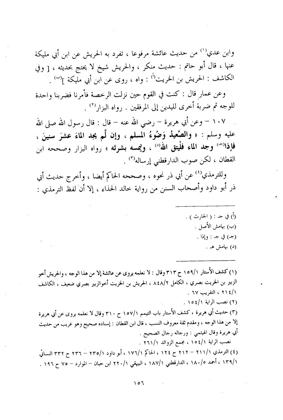 (¬3) حديث أبي هريرة، كشف الأستار باب التيمم 1/ 157 ح 310 وقال لا نعلمه يروى عن أبي هريرة إلا من هذا الوجه، ومقدم ثقة معروف النسب، قال ابن القطان: إسناده صحيح وهو غريب من حديث أبي هريرة وقال الهيثمي: ورجاله رجال الصحيح.