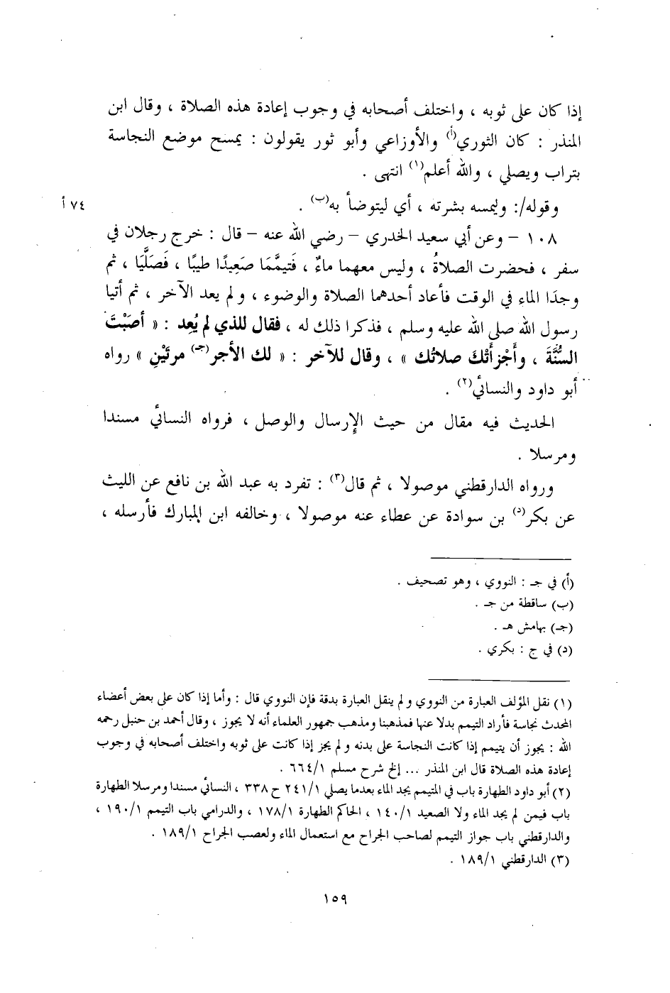(¬2) أبو داود الطهارة باب في المتيمم يجد الماء بعدما يصلي 1/ 241 ح 338، النسائي مسندًا ومرسلا الطهارة باب فيمن لم يجد الماء ولا الصعيد 1/ 140، الحاكم الطهارة 1/ 178، والدرامي باب التيمم 1/ 190، والدارقطني باب جواز التيمم لصاحب الجراح مع استعمال الماء ولعصب الجراح 1/ 189.