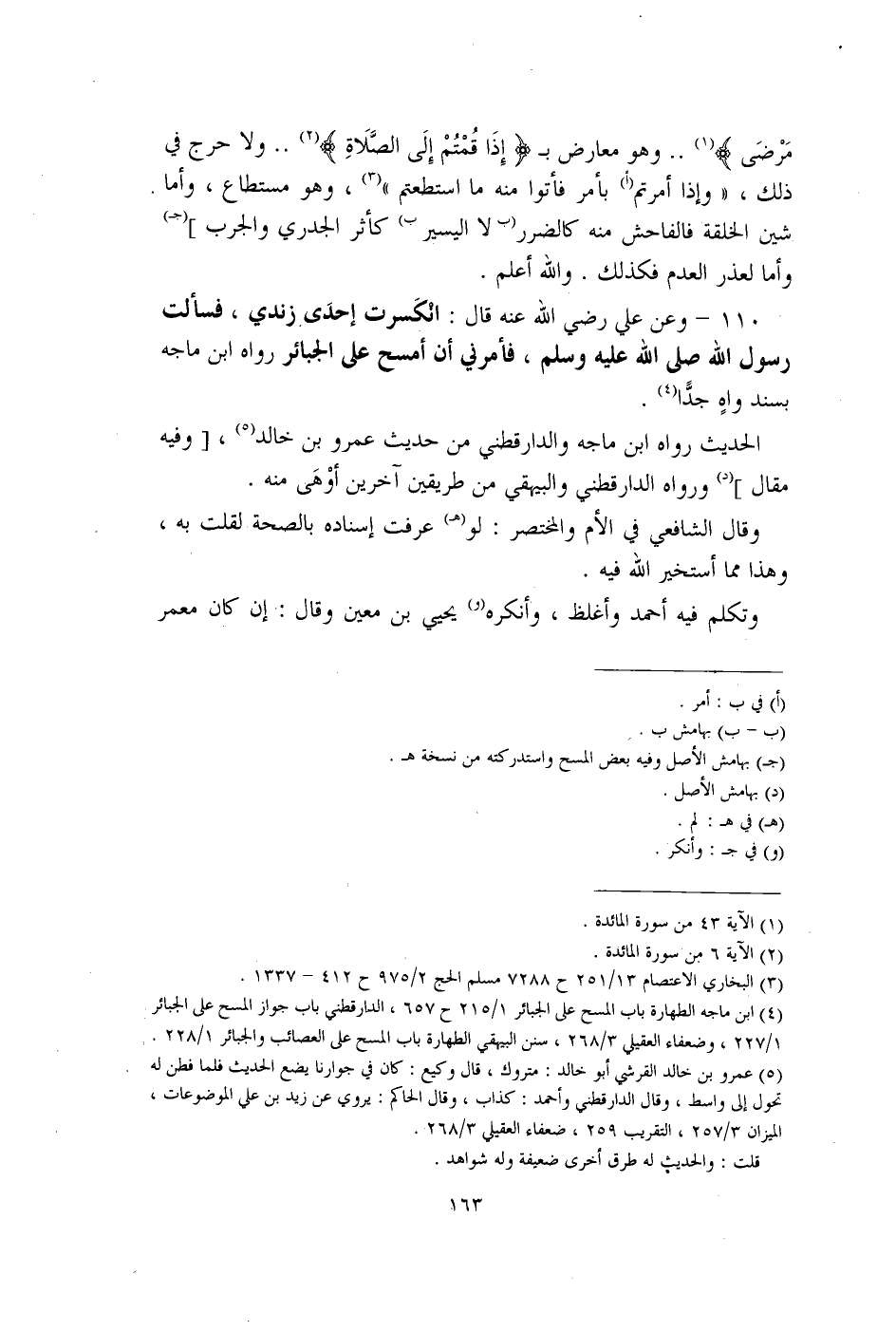 110 - وعن علي رضي الله عنه قال: انكَسرت إحدَى زندي، فسألت رسول الله صلى الله عليه وسلم، فأمرني أن أمسح على الجبائر رواه ابن ماجه بسند واهٍ جدًّا (¬4).