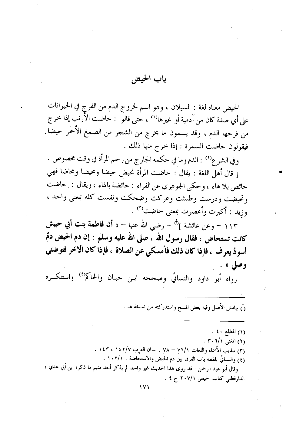113 - وعن عائشة] (أ) - رضي الله عنها - "أن فاطمة بنت أبي حبيش كانت تستحاض، فقال رسول الله، صلى الله عليه وسلم: إن دم الحيض دمٌ أسودُ يعرف، فإذا كان ذلك فأمسكي عن الملاة، فإذا كان الآخر فتوضئي وصلي".