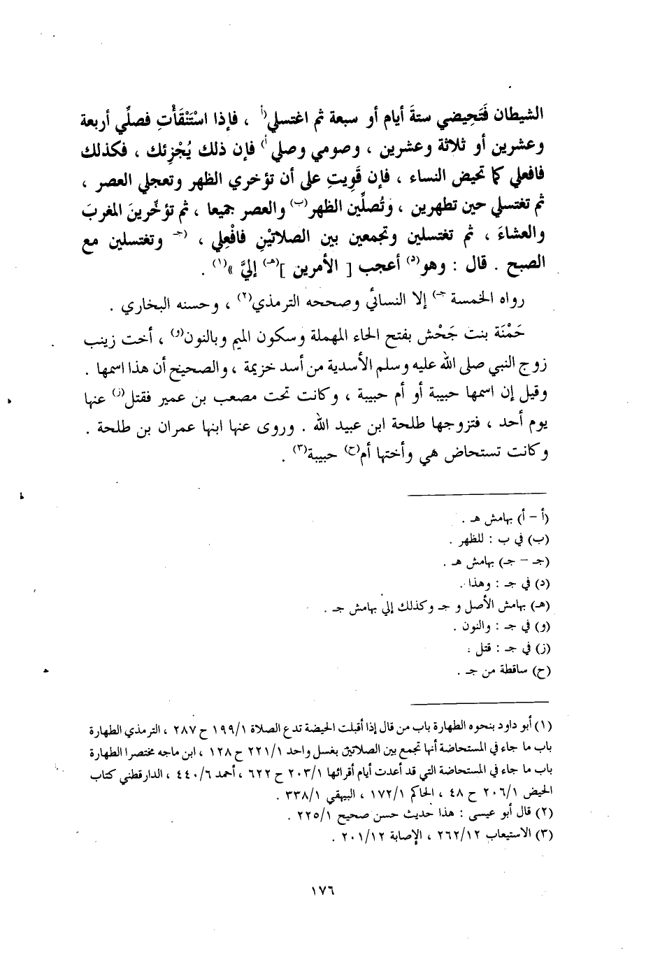 الشيطان فَتَحِيضي ستةَ أيام أو سبعة ثم اغتسلي (أفإذا اسْتَنْقَأتِ فصلّي أربعة وعشرين أو ثلاثة وعشرين، وصومي وصلي أ) فإن ذلك يُجْزِئك، فكذلك فافعلي كما تحيض النساء، فإن قَوِيتِ على أن تؤخري الظهر وتعجلي العصر، ثم تغتسلي حين تطهرين، وتُصلِّين الظهر (ب) والعصر جميعا، ثم تؤخِّرينَ المغربَ والعشاءَ، ثم تغتسلين وتجمعين بين الصلاتيْنِ فافْعِلي، (جـ وتغتسلين مع الصبح. قال: وهو (د) أعجب [الأمرين] (5) (هـ) إليَّ" (¬1).