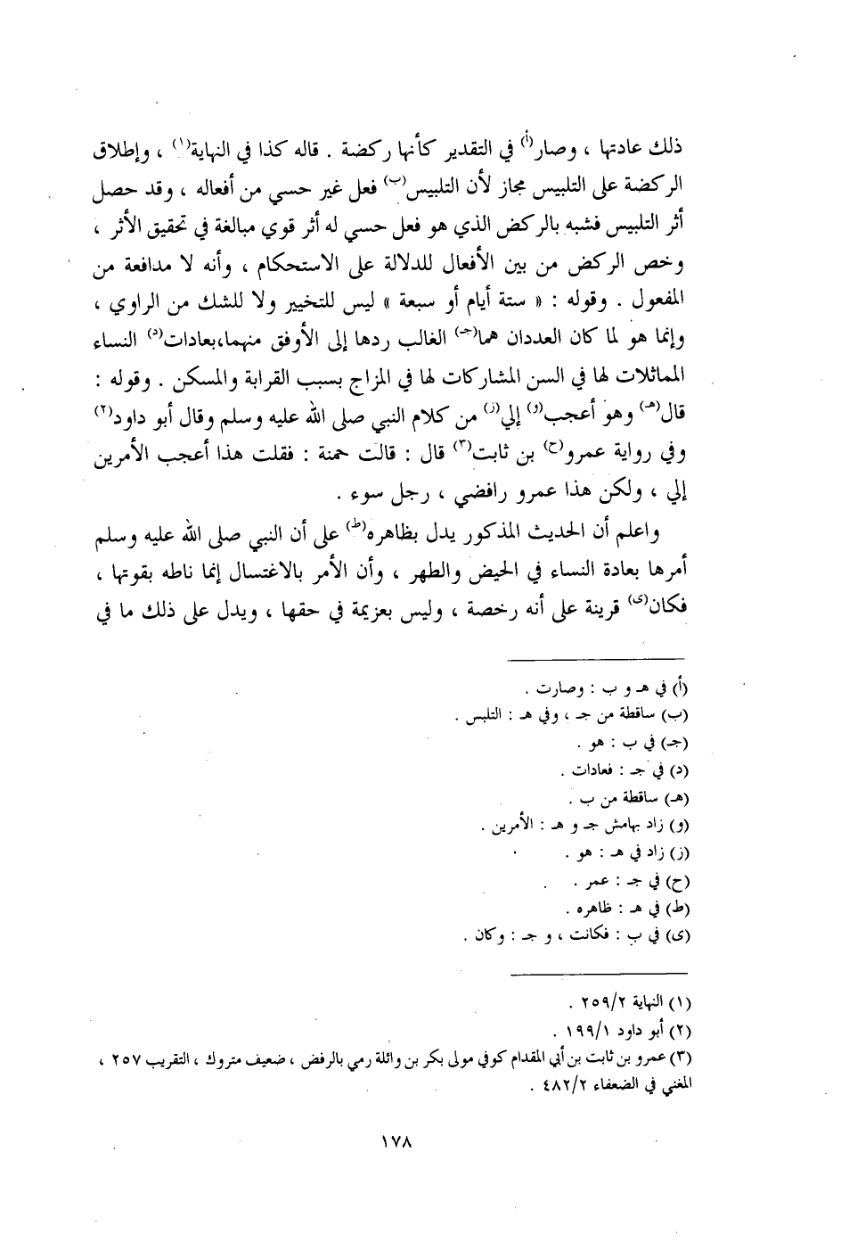 أثر التلبيس فشبه بالركض الذي هو فعل حسي له أثر قوي مبالغة في تحقيق الأثر، وخص الركض من بين الأفعال للدلالة على الاستحكام، وأنه لا مدافعة من المفعول. وقوله: "ستة أيام أو سبعة" ليس للتخيير ولا للشك من الراوي، وإنما هو لما كان العددان هما (جـ) الغالب ردها إلى الأوفق منهما، بعادات (د) النساء المماثلات لها في السن المشاركات لها في المزاج بسبب القرابة والمسكن. وقوله: قال (هـ) وهو أعجب (و) إلي (ز) من كلام النبي صلى الله عليه وسلم وقال أبو داود (¬2) وفي رواية عمرو (ح) بن ثابت (¬3) قال: قالت حمنة: فقلت هذا أعجب الأمرين إلي، ولكن هذا عمرو رافضي، رجل سوء.