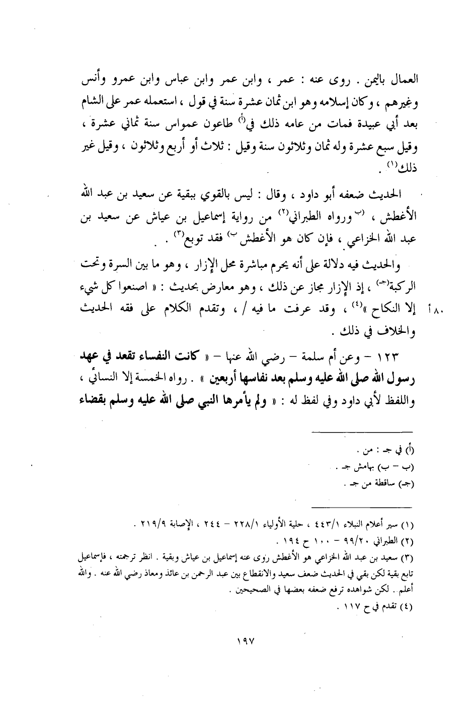 (¬3) سعيد بن عبد الله الخزاعي هو الأغطش روى عنه إسماعيل بن عياش وبقية. انظر ترجمته، فإسماعيل تابع بقية لكن بقي في الحديث ضعف سعيد والانقطاع بين عبد الرحمن بن عائذ ومعاذ رضي الله عنه. والله أعلم. لكن شواهده ترفع ضعفه بعضها في الصحيحين.