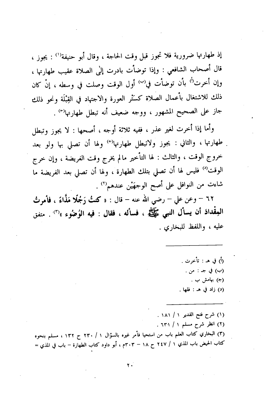 (¬3) البخاري كتاب العلم باب من استحيا فأمر غيره بالسؤال 1/ 230 ح 132، مسلم بنحوه كتاب الحيض باب المذي 1/ 247 ح 18 - 303 م، أبو داود كتاب الطهارة- باب في المذي =