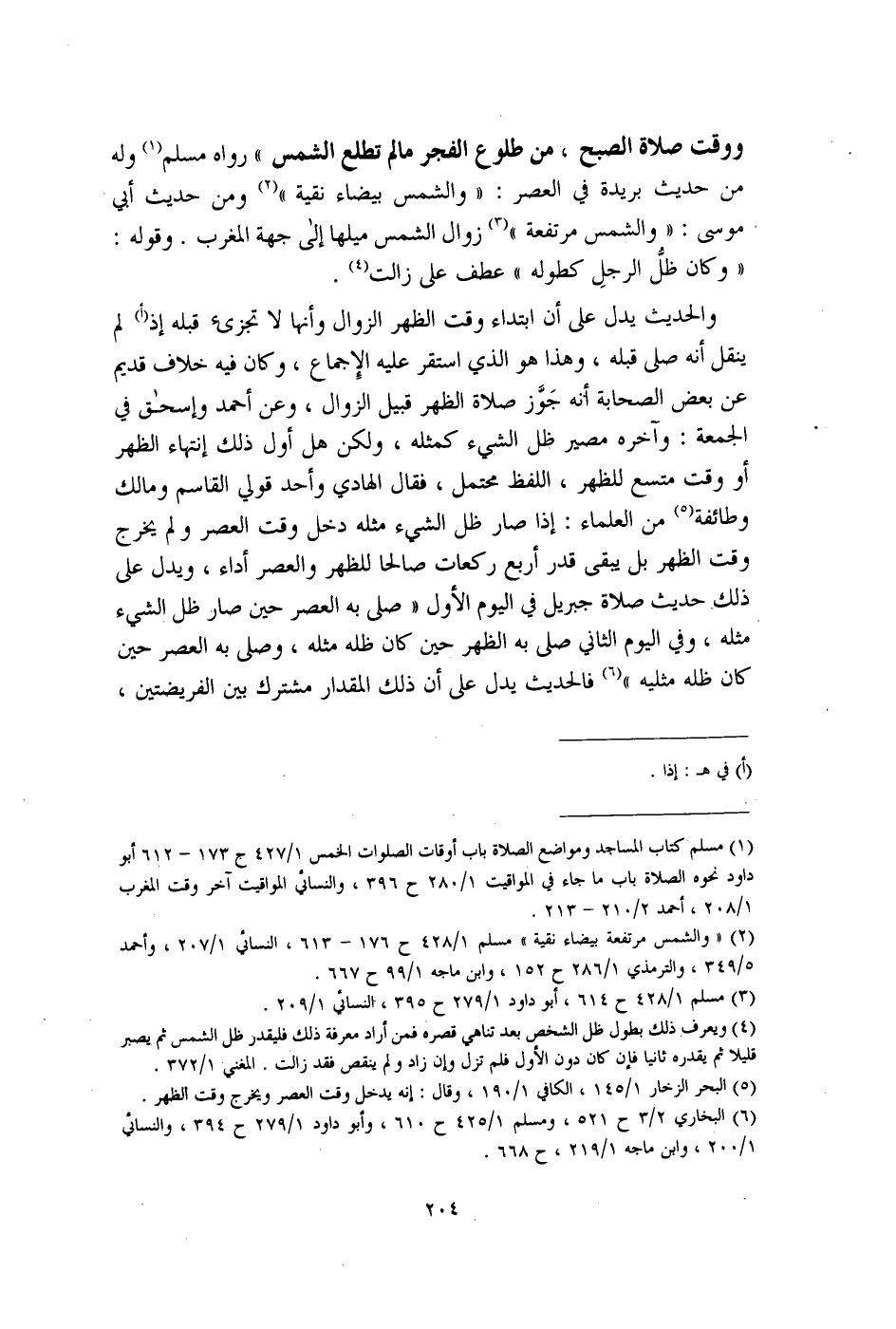 (¬2) "والشمس مرتفعة بيضاء نقية" مسلم 1/ 428 ح 176 - 613، النسائي 1/ 207، وأحمد 5/ 349، والترمذي 1/ 286 ح 152، وابن ماجه 1/ 99 ح 667.