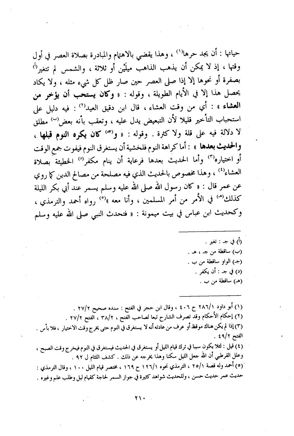 حياتهما: أن يجد حرها (¬1)، وهذا يقضي بالاهتمام والمبادرة بصلاة العصر في أول وقتها، إذ لا يمكن أن يذهب الذاهب ميلَيْن أو ثلاثة، والشمس لم تتغير (أ) بصفرة أو نحوها إلا إذا صلى العصر حين صار ظل كل شيء مثله، ولا يكاد يحصل هذا إلا في الأيام الطويلة، وقوله: "وكان يستحب أن يؤخر من العشاء": أي من وقت العشاء، قال ابن دقيق العيد (¬2): فيه دليل على استحباب التأخير قليلا لأن التبعيض يدل عليه، وتعقب بأنه بعض (ب) مطلق لا دلالة فيه على قلة ولا كثرة. وقوله: "و (جـ) كان يكره النوم قبلها، والحديث بعدها": أما كراهة النوم فلخشية أن يستغرق النوم فيفوت جمع الوقت أو اختياره (¬3) وأما الحديث بعدها فرعاية أن ينام مكفر (د) الخطيئة بصلاة العشاء (¬4)، وهذا مخصوص بالحديث الذي فيه مصلحة من مصالح الدين كما روي عن عمر قال: "كان رسول الله صلى الله عليه وسلم يسمر عند أبي بكر الليلة كذلك (هـ) في الأمر من أمر المسلمين، وأنا معه" (¬5) رواه أحمد والترمذي، وكحديث ابن عباس في بيت ميمونة: "فتحدث النبي صلى الله عليه وسلم