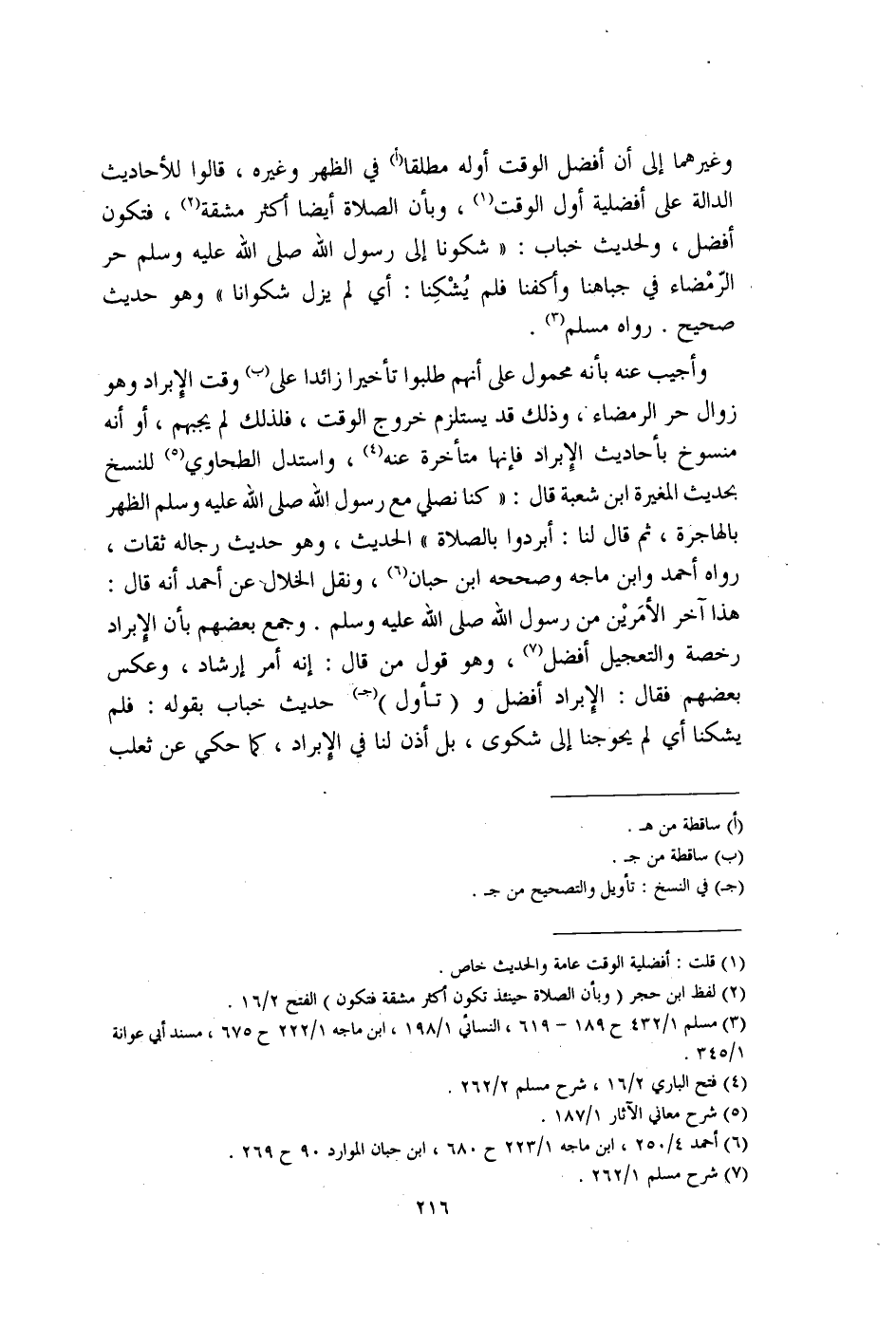 وأجيب عنه بأنه محمول على أنهم طلبوا تأخيرا زائدا على (ب) وقت الإبراد وهو زوال حر الرمضاء، وذلك قد يستلزم خروج الوقت، فلذلك لم يجبهم، أو أنه منسوخ بأحاديث الإِبراد فإنها متأخرة عنه (¬4)، واستدل الطحاوي (¬5) للنسخ بحديث المغيرة ابن شعبة قال: "كنا نصلي مع رسول الله صلى الله عليه وسلم الظهر بالهاجرة، ثم قال لنا: أبردوا بالصلاة" الحديث، وهو حديث رجاله ثقات، رواه أحمد وابن ماجه وصححه ابن حبان (¬6)، ونقل الخلال" عن أحمد أنه قال: هذا آخر الأمَريْن من رسول الله صلى الله عليه وسلم. وجمع بعضهم بأن الإبراد رخصة والتعجيل أفضل (¬7)، وهو قول من قال: إنه أمر إرشاد، وعكس بعضهم فقال: الإِبراد أفضل و (تأول) (جـ) حديث خباب بقوله: فلم يشكنا أي لم يحوجنا إلى شكوى، بل أذن لنا في الإبراد، كما حكى عن ثعلب