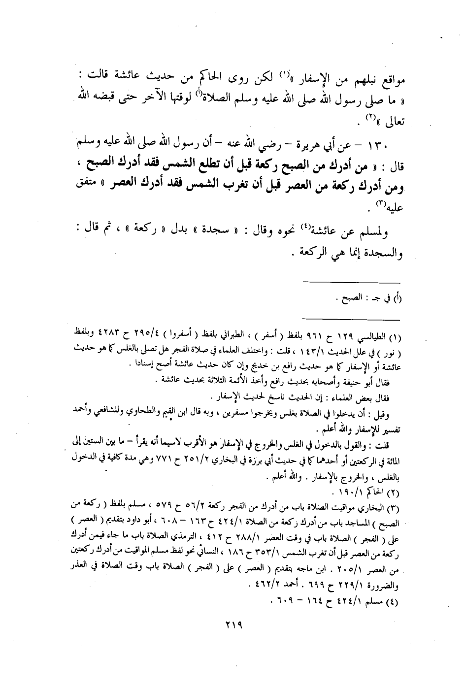 (¬1) الطيالسي 129 ح 961 بلفظ (أسفر)، الطبراني بلفظ (أسفروا) 4/ 295 ح 4283 وبلفظ (نور) في علل الحديث 1/ 143، قلت: واختلف العلماء في صلاة الفجر هل تصلي بالغلس كما هو حديث عائشة أو الإسفار كما هو حديث رافع بن خديج وإن كان حديث عائشة أصح إسنادا.