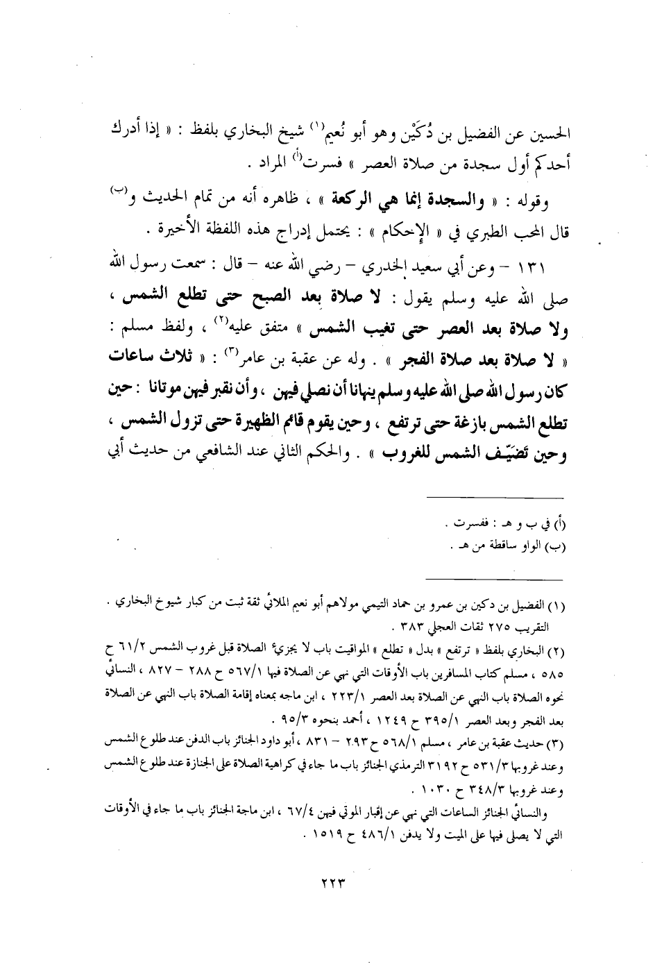 131 - وعن أبي سعيد الخدري - رضي الله عنه - قال: سمعت رسول الله صلى الله عليه وسلم يقول: لا صلاة بعد الصبح حتى تطلع الشمس، ولا صلاة بعد العصر حتى تغيب الشمس" متفق عليه (¬2)، ولفظ مسلم: "لا صلاة بعد صلاة الفجر". وله عن عقبة بن عامر (¬3): "ثلاث ساعات كان رسول الله صلى الله عليه وسلم ينهانا أن نصلي فيهن، وأن نقبر فيهن موتانا: حين تطلع الشمس بازغة حتى ترتفع، وحين يقوم قائم الظهيرة حتى تزول الشمس، وحين تَضَيّف الشمس للغروب". والحكم الثاني عند الشافعي من حديث أبي