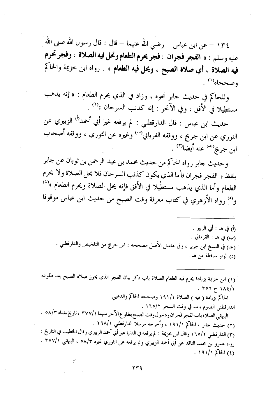 134 - عن ابن عباس -رضي الله عنهما - قال: قال رسول الله صلى الله عليه وسلم: "الفجر فجران: فجر يحرم الطعام وتحل فيه الصلاة، وفجر تحرم فيه الصلاة، أي صلاة الصبح، ويحل فيه الطعام". رواه ابن خزيمة والحاكم وصححاه (¬1).