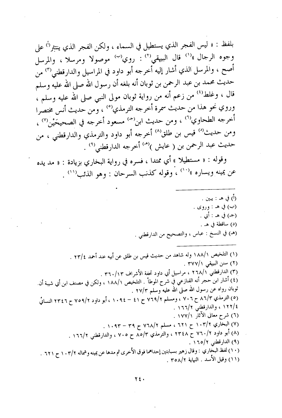 بلفظ: "ليس الفجر الذي يستطيل في السماء، ولكن الفجر الذي ينتبز (أ) على وجوه الرجال" (¬1) قال البيهقي (¬2): روي (ب) موصولا ومرسلا، والمرسل أصح، والمرسل الذي أشار إليه أخرجه أبو داود في المراسيل والدارقطني (¬3) من حديث محمد بن عبد الرحمن بن ثوبان أنه بلغه أن رسول الله صلى الله عليه وسلم قال، وغلط (¬4) من زعم أنه من رواية ثوبان مولى النبي صلى الله عليه وسلم، وروي نحو هذا من حديث سمرة أخرجه الترمذي (¬5)، ومن حديث أنس مختصرًا أخرجه الطحاوي (¬6)، ومن حديث ابن (جـ) مسعود أخرجه في الصحيحَيْن (¬7)، ومن حديث (د) قيس بن طلق (¬8) أخرجه أبو داود والترمذي والدارقطني، من حديث عبد الرحمن بن (عايش) (هـ) أخرجه الدارقطني (¬9).