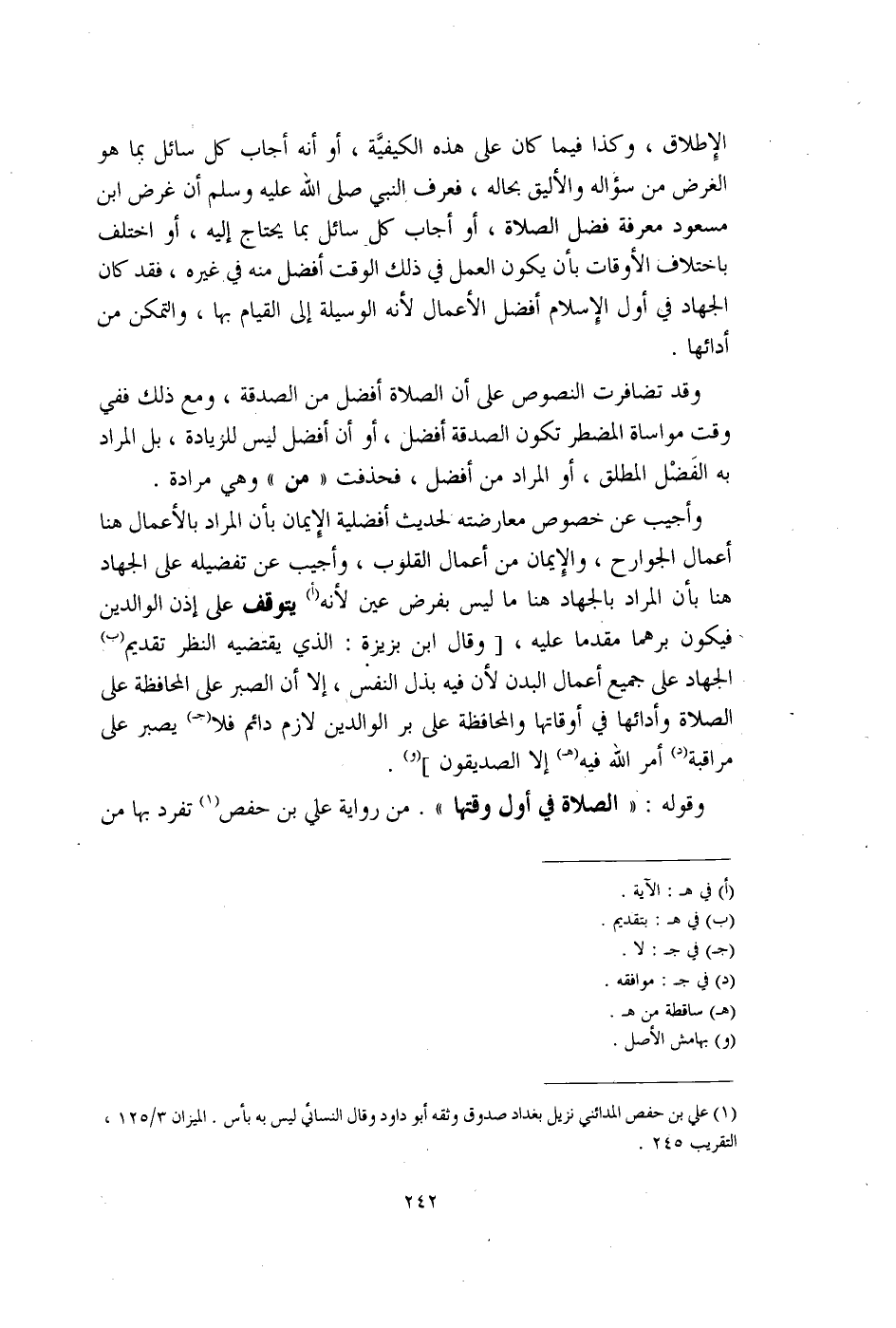 وأجيب عن خصوص معارضته لحديث أفضلية الإِيمان بأن المراد بالأعمال هنا أعمال الجوارح، والإِيمان من أعمال القلوب، وأجيب عن تفضيله على الجهاد هنا بأن المراد بالجهاد هنا ما ليس بفرض عين لأنه (أ) يتوقف على إذن الوالدين فيكون برهما مقدما عليه، [وقال ابن بزيزة: الذي يقتضيه النظر تقديم (ب) الجهاد على جميع أعمال البدن لأن فيه بذل النفس، إلا أن الصبر على المحافظة على الصلاة وأدائها في أوقاتها والمحافظة على بر الوالدين لازم دائم فلا (جـ) يصبر على مراقبة (د) أمر الله فيه (هـ) إلا الصديقون] (و).