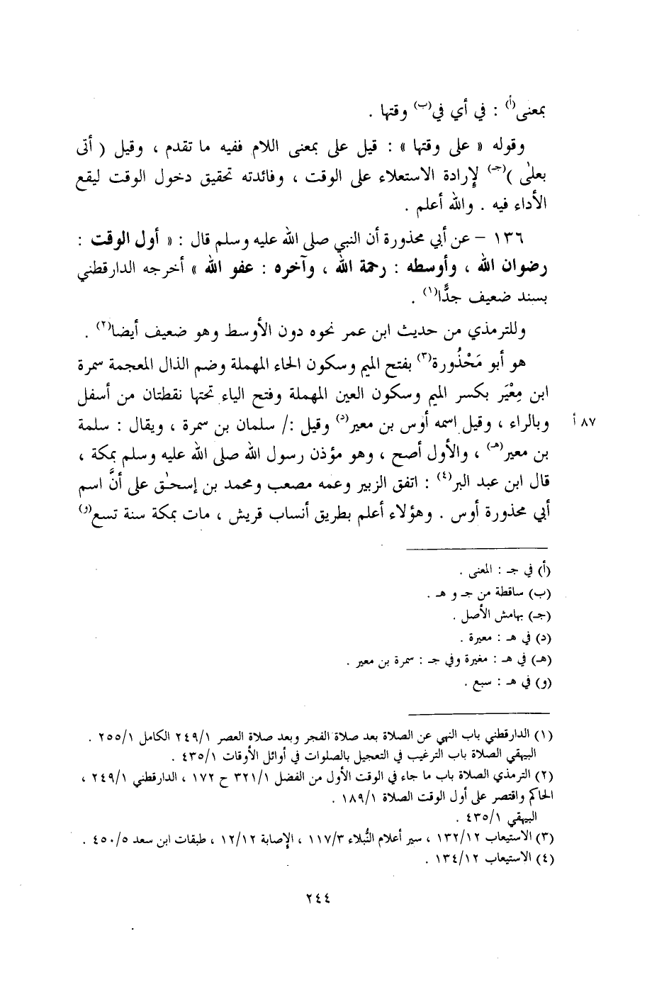 136 - عن أبي محذورة أن النبي صلى الله عليه وسلم قال: "أول الوقت: رضوان الله، وأوسطه: رحمة الله، وآخره: عفو الله" أخرجه الدارقطني بسند ضعيف جدًّا (¬1).
