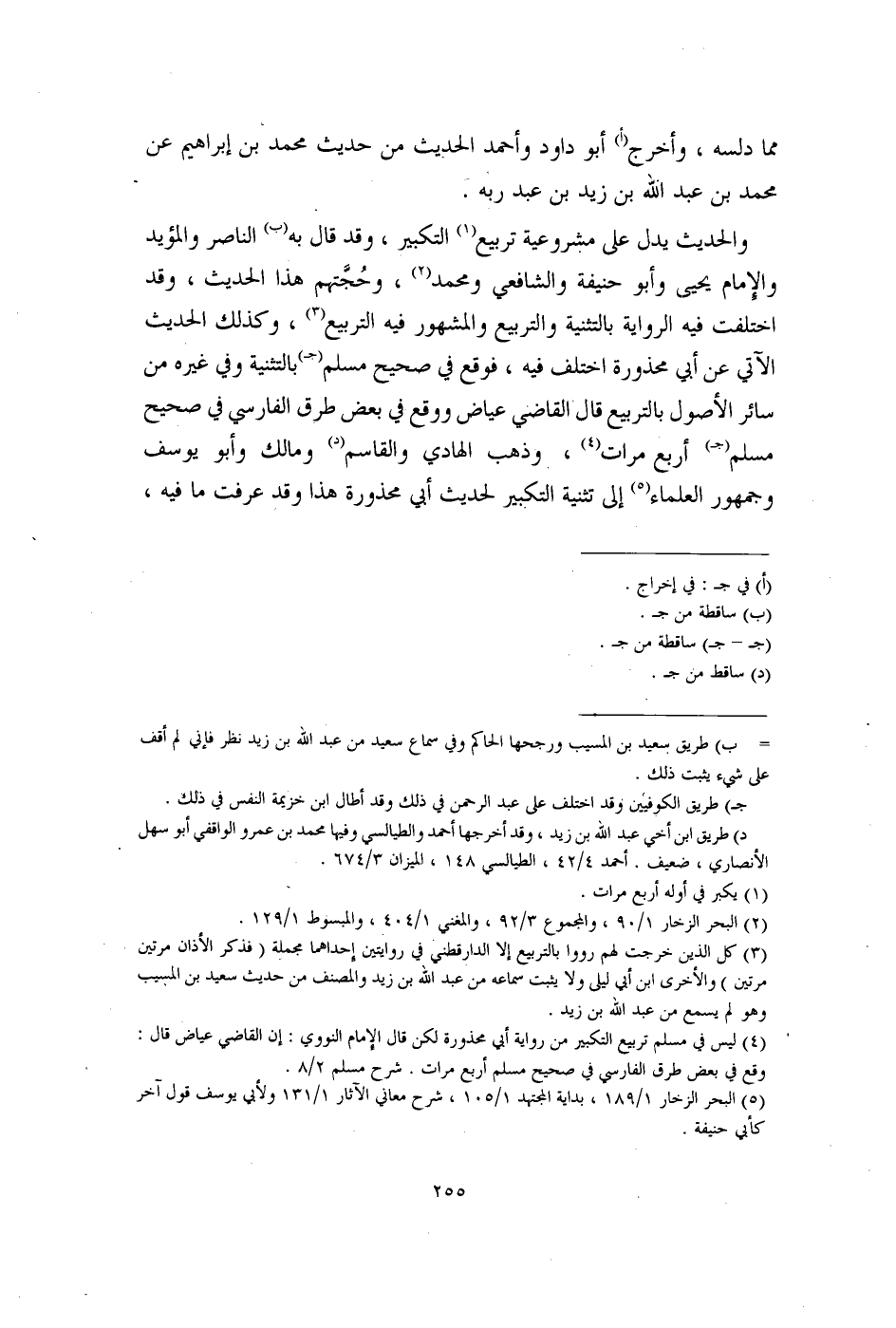(¬3) كل الذين خرجت لهم رووا بالتربيع إلا الدارقطني في روايتين إحداهما مجملة (فذكر الأذان مرتين مرتين) والأخرى ابن أبي ليلى ولا يثبت سماعه من عبد الله بن زيد والمصنف من حديث سعيد بن المسيب وهو لم يسمع من عبد الله بن زيد.