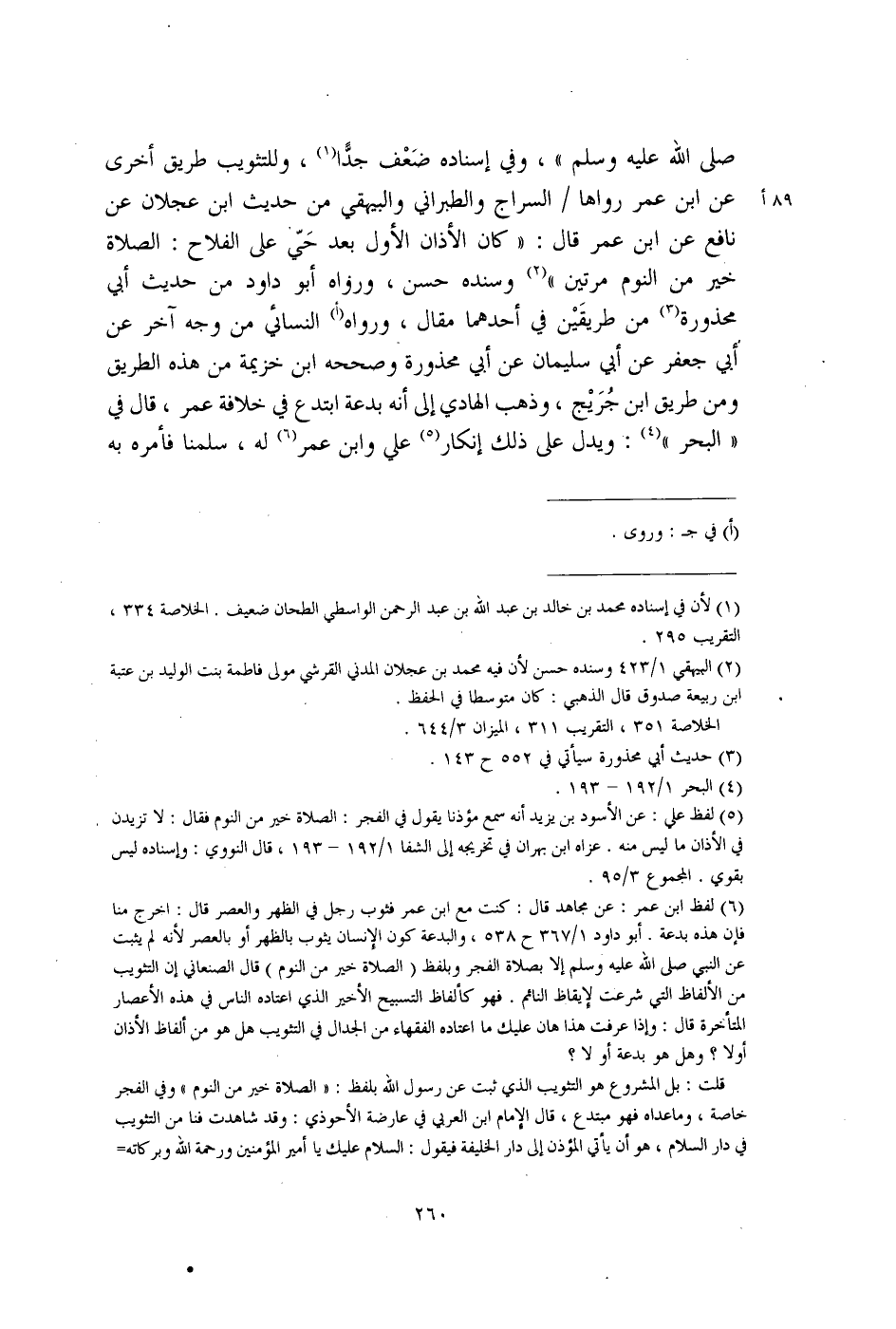 (¬6) لفظ ابن عمر: عن مجاهد قال: كنت مع ابن عمر فثوب رجل في الظهر والعصر قال: اخرج منا فإن هذه بدعة. أبو داود 1/ 367 ح 538، والبدعة كون الإنسان يثوب بالظهر أو بالعصر لأنه لم يثبت عن النبي صلى الله عليه وسلم إلا بصلاة الفجر وبلفظ (الصلاة خير من النوم) قال الصنعاني إن التثويب من الألفاظ التي شرعت لإيقاظ النائم. فهو كألفاظ التسبيح الأخير الذي اعتاده الناس في هذه الأعصار المتأخرة قال: وإذا عرفت هذا هان عليك ما اعتاده الفقهاء من الجدال في التثويب هل هو من ألفاظ الأذان أولًا؟ وهل هو بدعة أو لا؟